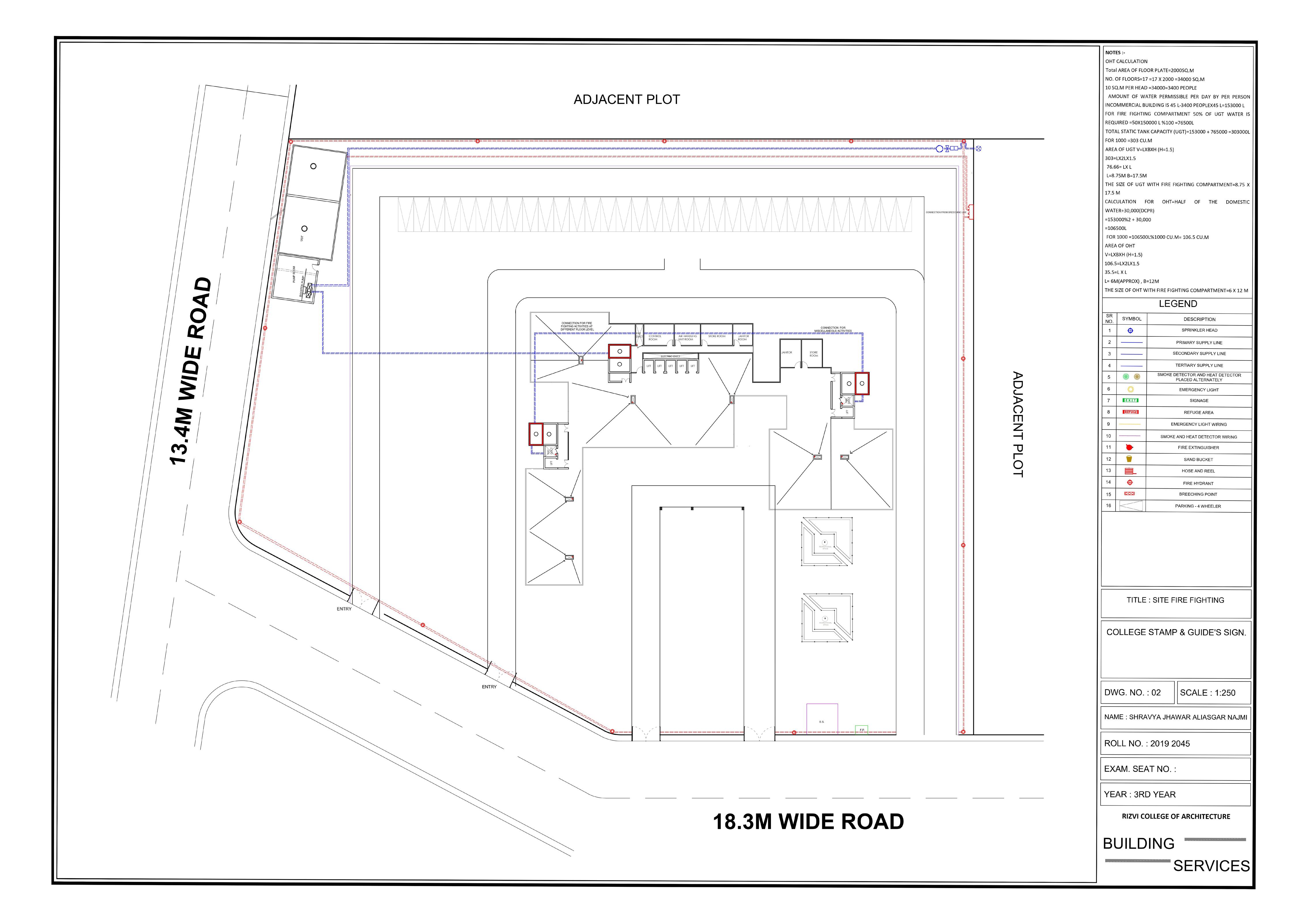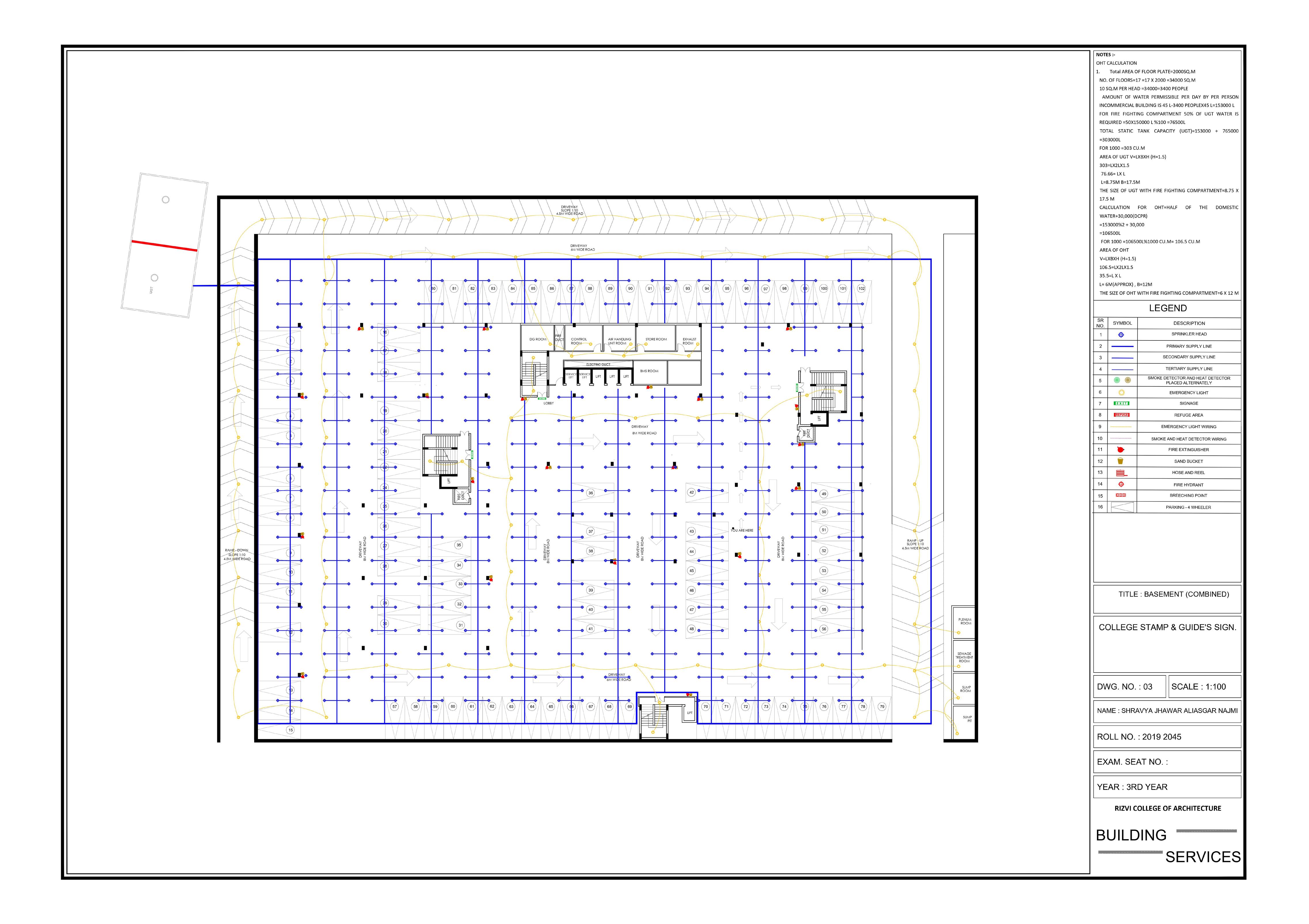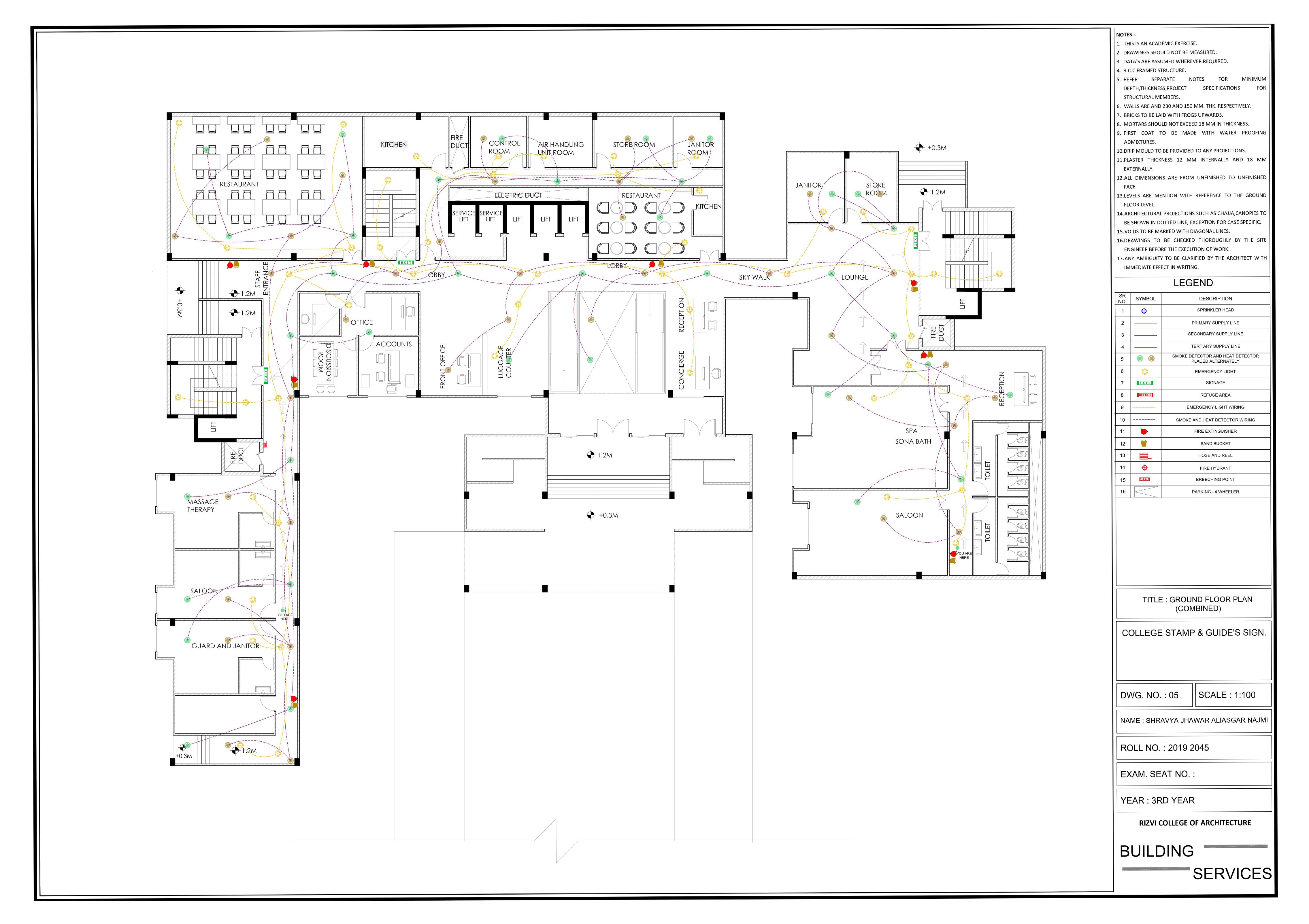 MUMTY ROOM LIFT SHAFT OHT STAIRCASE STAIRCASE STAIRCASE STAIRCASE STAIRCASE STAIRCASE STAIRCASE STAIRCASE D1 W3 W3 W3 W3 W3 W3 W3 W3 W3 SECTION A-A' LOBBY LOBBY LOBBY LOBBY LOBBY LOBBY LOBBY LOBBY LOBBY LOBBY LOBBY LOBBY LOBBY LOBBY COLLEGE NAMERIZVI COLLEGE OF ARCHITECTURE YEAR & SEM-2023,SEM6 EXAM SEAT No. ROLL No.-2019 NAME- SHRAVYA JHAWAR DWG No. & SCALE-50 COLLEGE STAMP & SIGN. SECTIONS LEGEND NOTES 1. THIS IS AN ACADEMIC EXERCISE. 2. DRAWINGS SHOULD NOT BE MEASURED. 3. DATA'S ARE ASSUMED WHEREVER REQUIRED. 4. R.C.C FRAMED STRUCTURE. 5. REFER SEPARATE NOTES FOR MINIMUM DEPTH,THICKNESS,PROJECT SPECIFICATIONS FOR STRUCTURAL MEMBERS. 6. WALLS ARE AND 230 AND 150 MM. THK. RESPECTIVELY. 7. BRICKS TO BE LAID WITH FROGS UPWARDS. 8. MORTARS SHOULD NOT EXCEED 18 MM IN THICKNESS. 9. FIRST COAT TO BE MADE WITH WATER PROOFING ADMIXTURES. 10.DRIP MOULD TO BE PROVIDED TO ANY PROJECTIONS. 11.PLASTER THICKNESS 12 MM INTERNALLY AND 18 MM EXTERNALLY. 12.ALL DIMENSIONS ARE FROM UNFINISHED TO UNFINISHED FACE. 13.LEVELS ARE MENTION WITH REFERENCE TO THE GROUND FLOOR LEVEL. 14.ARCHITECTURAL PROJECTIONS SUCH AS CHAJJA,CANOPIES TO BE SHOWN IN DOTTED LINE, EXCEPTION FOR CASE SPECIFIC. 15.VOIDS TO BE MARKED WITH DIAGONAL LINES. 16.DRAWINGS TO BE CHECKED THOROUGHLY BY THE SITE ENGINEER BEFORE THE EXECUTION OF WORK. 17.ANY AMBIGUITY TO BE CLARIFIED BY THE ARCHITECT WITH IMMEDIATE EFFECT IN WRITING.