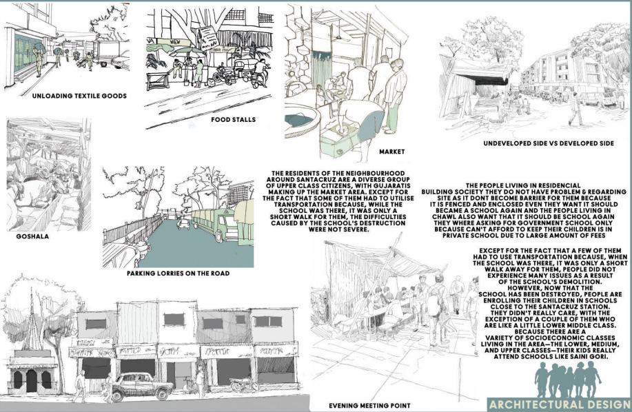 The site is present near the domestic airport in Santacruz, Mumbai. The buildings hence are not more than 5 floors tall, since they follow the AAI construction rules. It is situated on a secondary road which is intern connected to the SV Road Flyover. It has informal settlements on the northern side of the site and neccesary amenities around it.