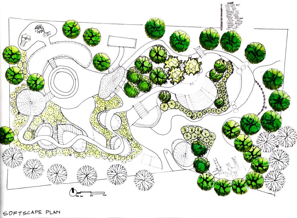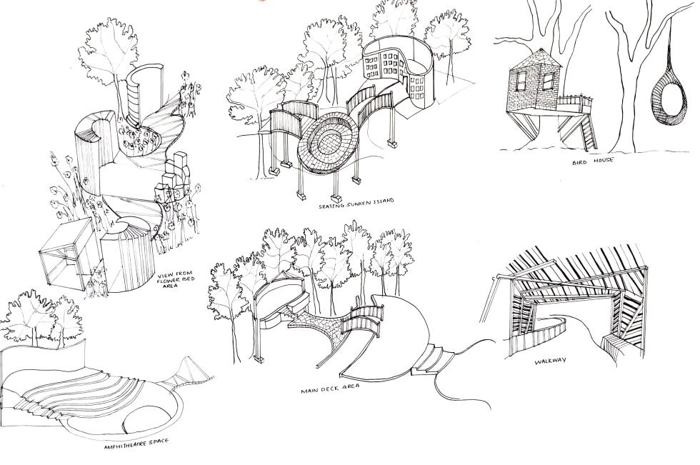 The design of the park has been taken place keeping in mind the surrounding environment. The park incorporates a water body within it and has activities spaced around it. The park has been planned keeping in mind that it stimulates all the 5 senses as and when one moves from one space to the other. the pavemnts materials , to the flowers ,tress ,etc. placed have been done for the same.