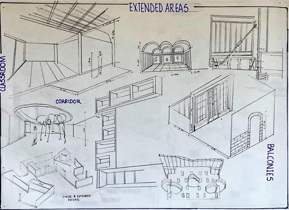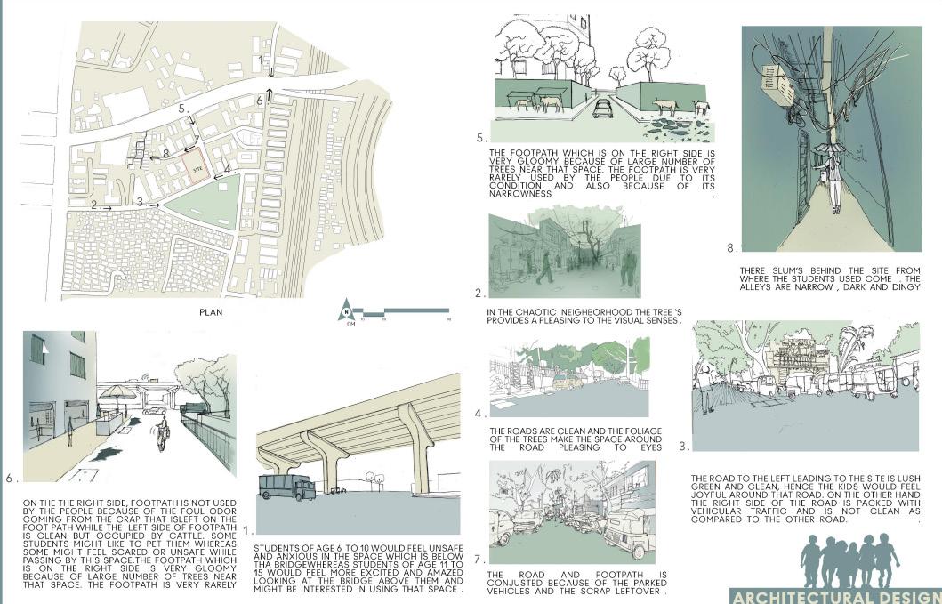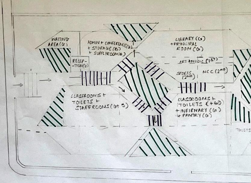 The plan indicates that of a school with built up area of 2000sq.m. for claases upto 10th grade. The interior spaces of the project were designed first and the the facades and the extreioir spaces. The school has been designed keeping in mind a space for specially abled children as well. There is a small transition space between two classroom to stimulate communication and also encoourage the students to help form a bond with the specially abled children. the two facades opposite to one another are connected via bridges that overlook the ground below and is covered with glass above.