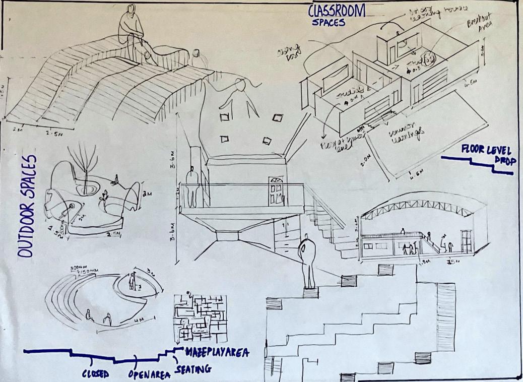 The building has clssrooms on one side and activity area on the other which are then interlinked via a bridge. The design focuses on inclusion, transition spaces and solid and void play. materials used are rcc , fly ash bricks , since they are locally available.