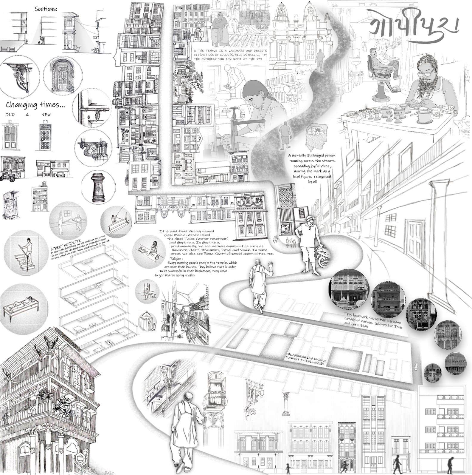 The entire lane of gopipura was documented , which depicts the pol houses and the planning of the area. The interactions caught on the way with people were noted and a detail study of demographics to took place.