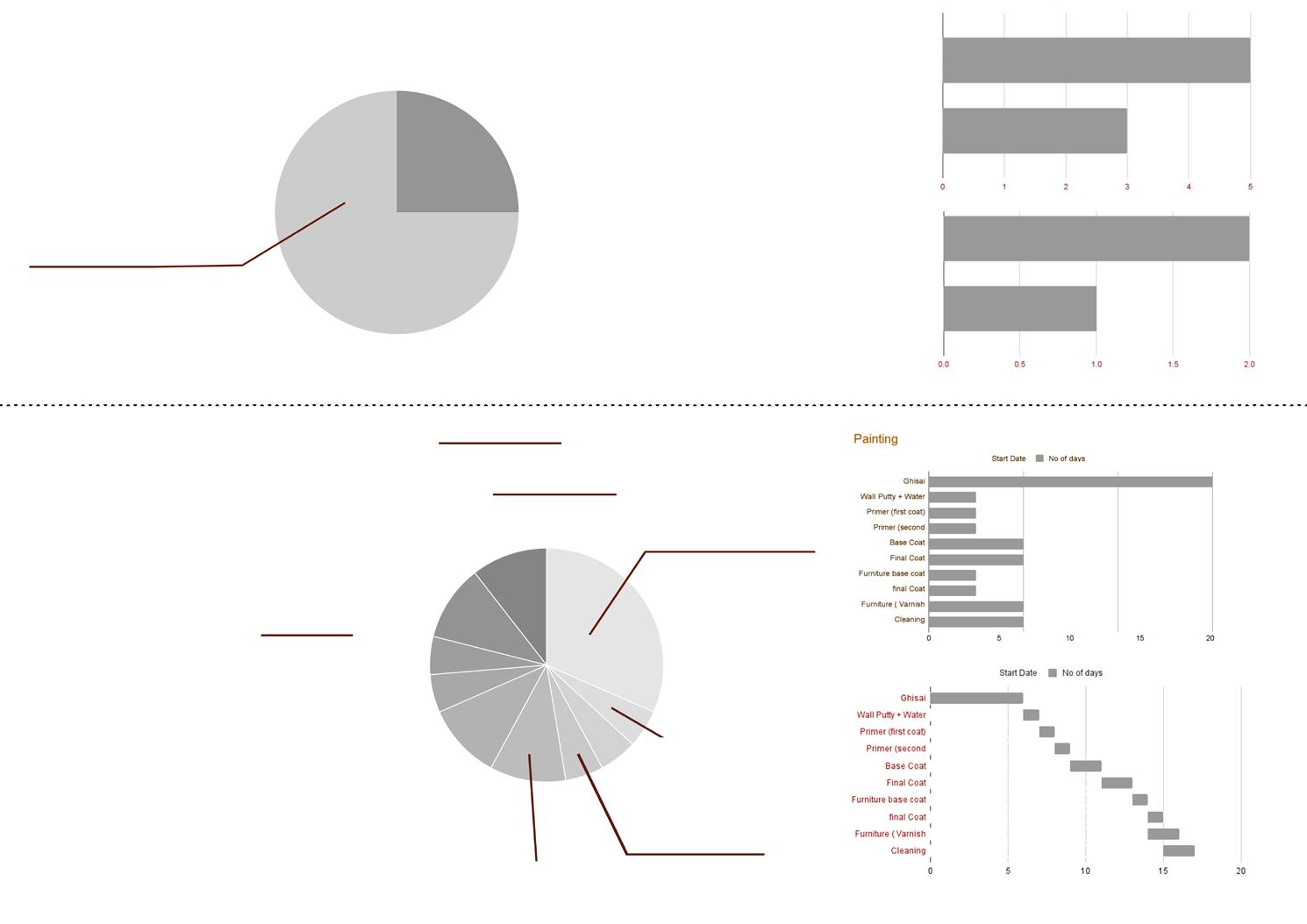 4) PROJECT MANAGEMENT:- The project was to renovate the entire classroom within a budget , via using various calcultions such as PERT,etc. For painting we divided the activities in an order that would take place on the site. To name a few were Ghisai, wall putty, waterproofing , primer and final coat. We then used bar graph calculations to calculate the approximate days used for every activity. After doing so , we then used gant chart to overlap the time taken by each activity to get the approximate total number of days for the painting to take place.