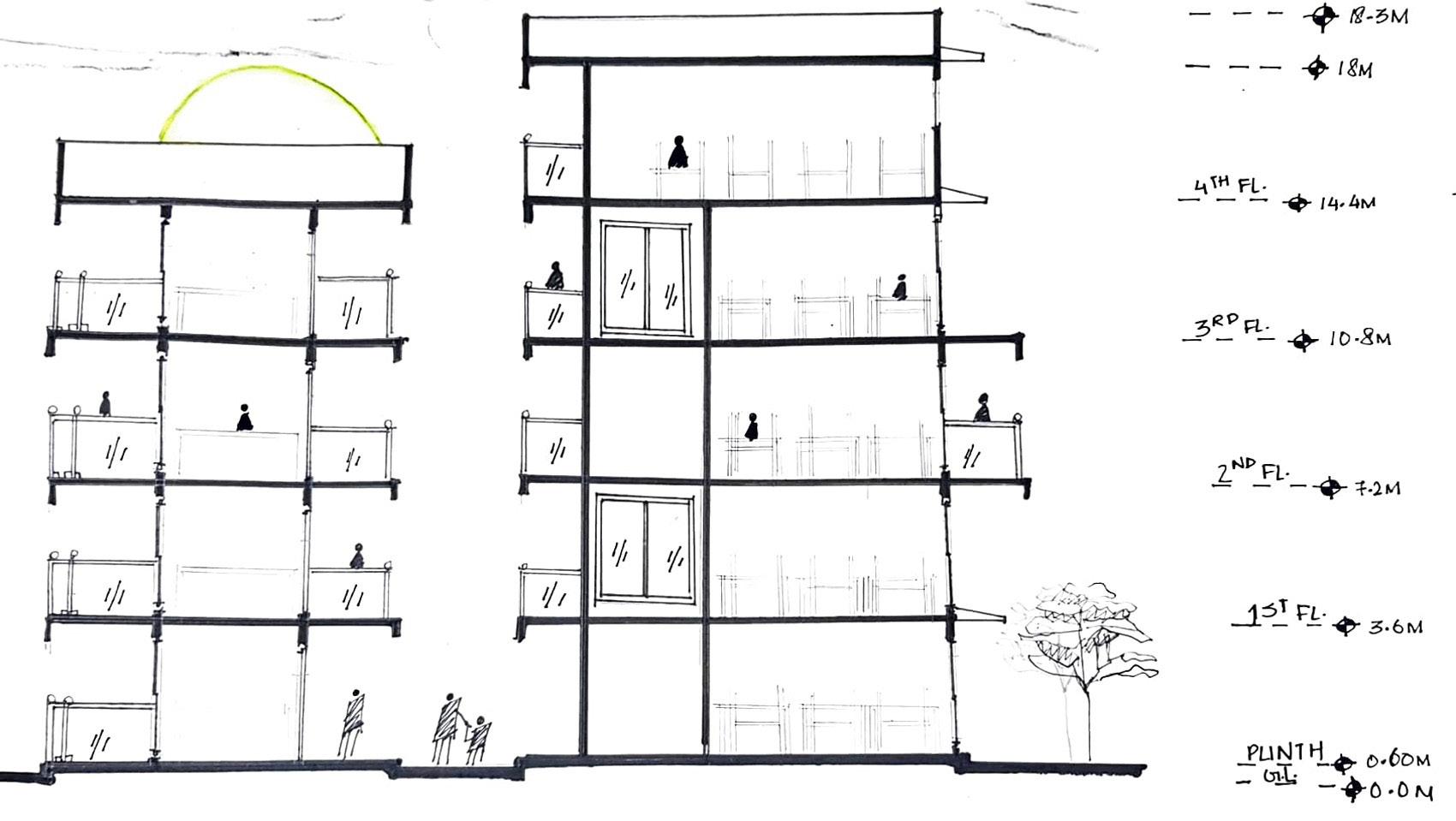 The site is present near the domestic airport in Santacruz, Mumbai. The buildings hence are not more than 5 floors tall, since they follow the AAI construction rules. It is situated on a secondary road which is intern connected to the SV Road Flyover. It has informal settlements on the northern side of the site and neccesary amenities around it.