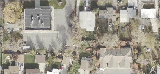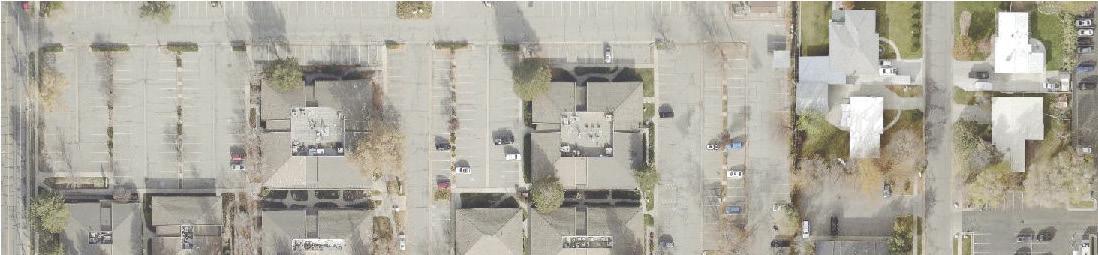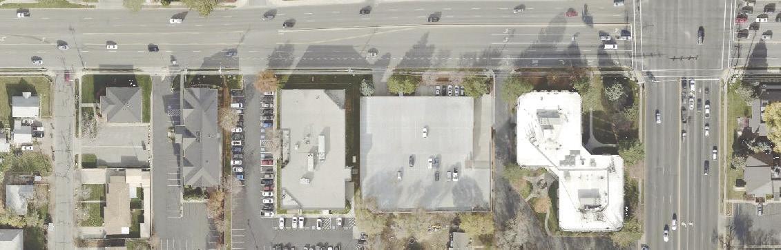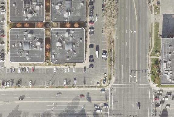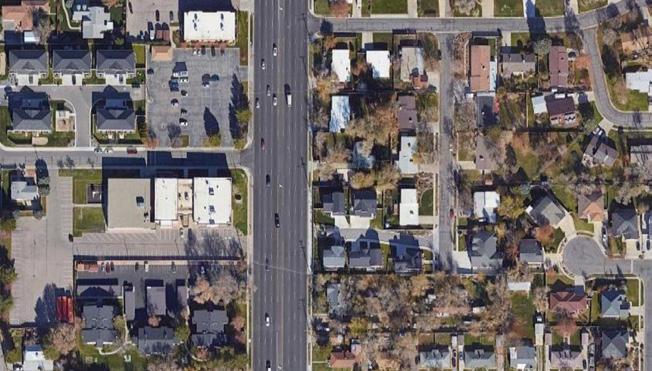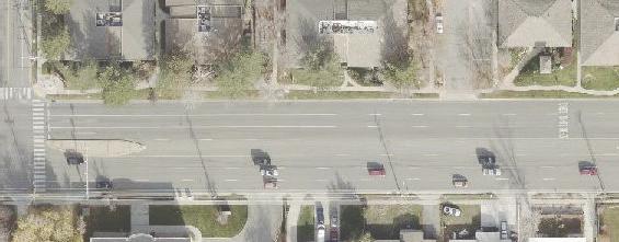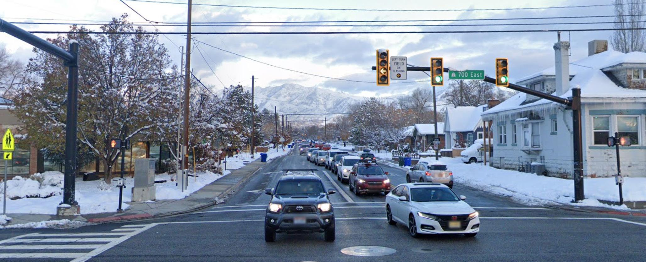 The neighborhood around the street segment 4500 S between 500 E and 700 E features a mix of residential multifamily and general office zoning. The three-lane main street, with a turning lane and nine lanes at the intersection, allows for fast, comfortable driving and easy access to commercial buildings. However, it poses challenges for pedestrians due to its width and speed limit of 40 miles per hour.
