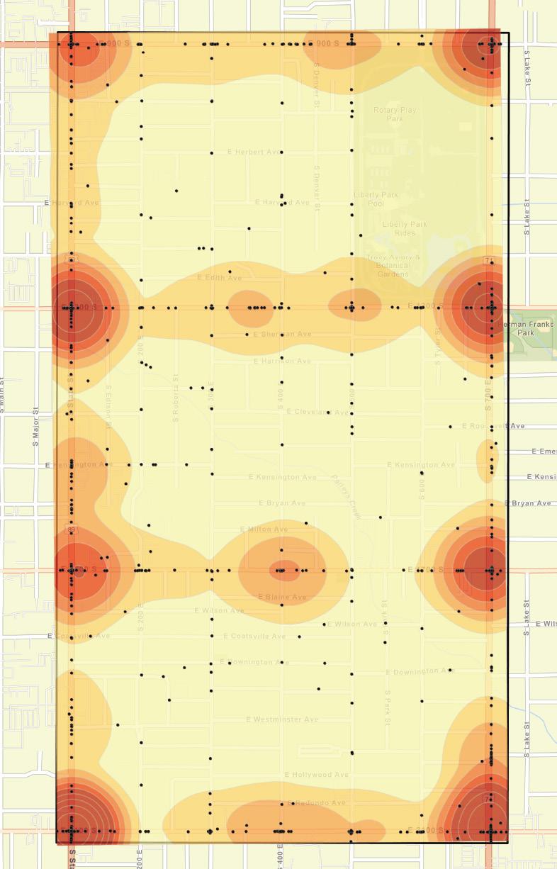 The crosswalk at 4500 S and 700 E allows pedestrians only 30 seconds to cross, which our analysis found takes about 25 seconds for an able-bodied person, potentially posing challenges for slower-moving individuals. The area lacks pedestrian-friendly infrastructure, with unsafe crosswalks and narrow sidewalks that are not wheelchair-accessible, leading to limited mobility options and prioritization of cars.
