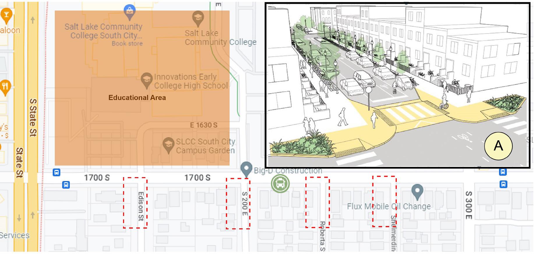 Mid-block crossing treatment at the intersections near the school facility along the streets branching-off of 1700 S.