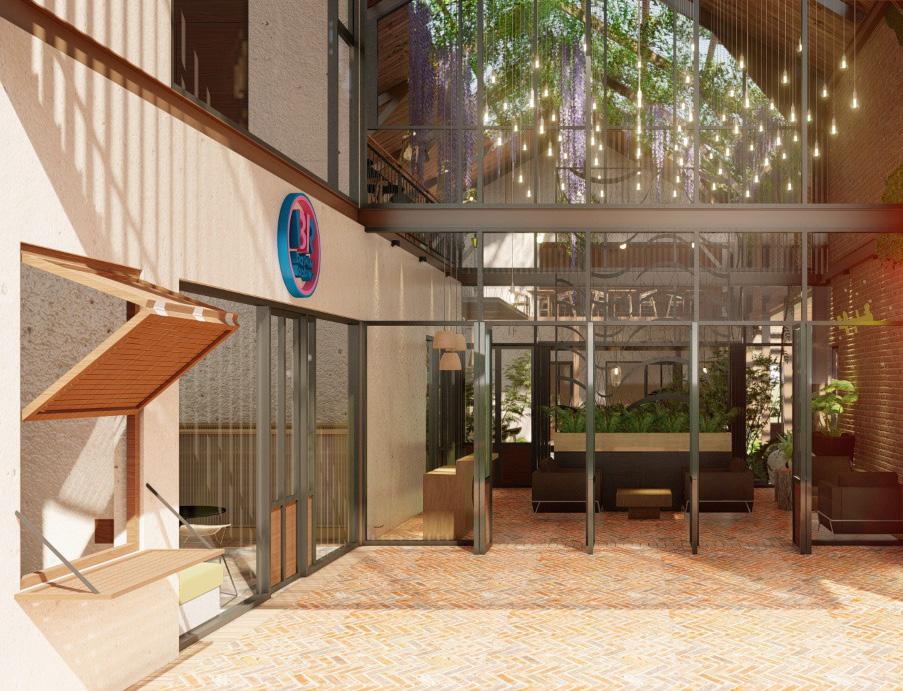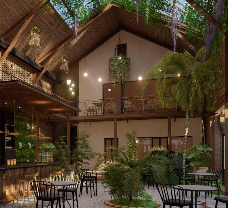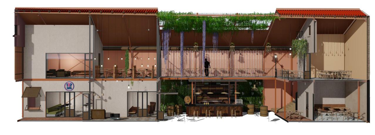 Bajeko Sekuwa is a popular resturant franchise in Nepal and this was designed by Naxalaya studio for a potential francise location in Biratnagar. (top) A sectional view of the entire facility at a glance. (left) Main foyer and entrance to the building .(right) Internal semi opencourtyard with bar and outdoor seating.