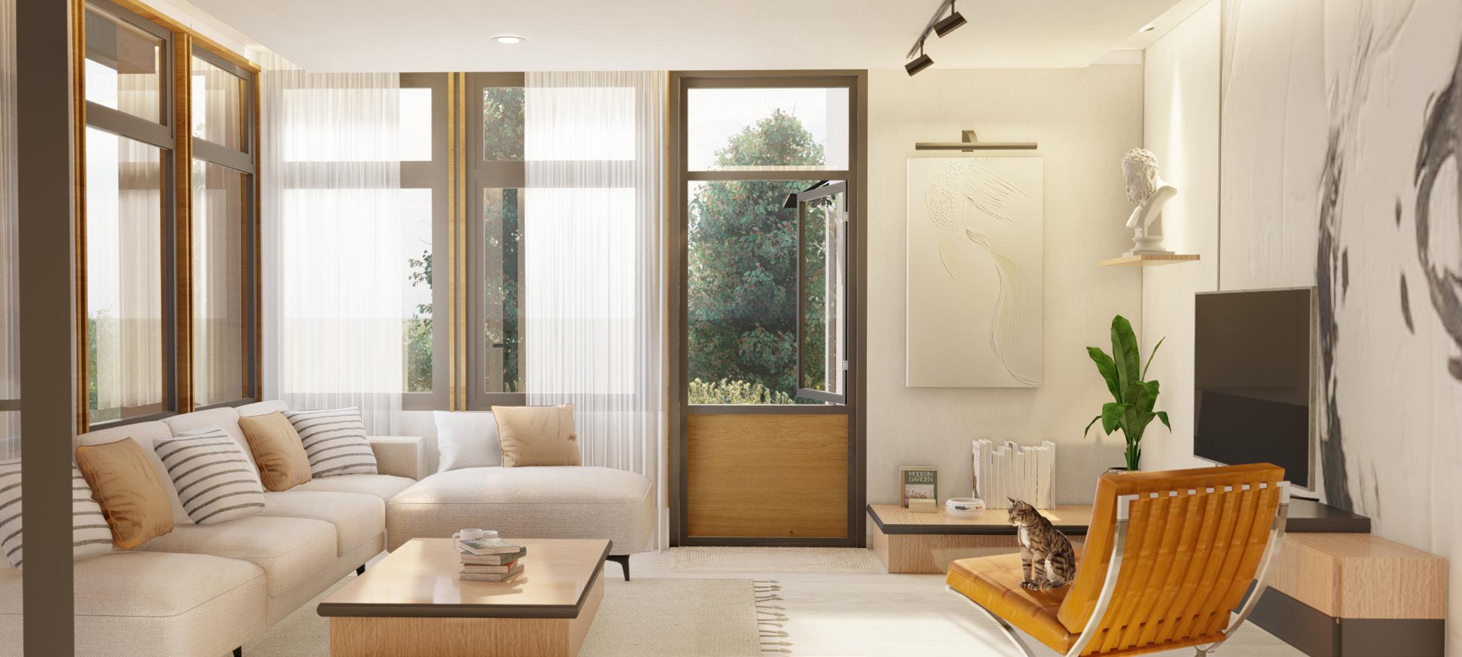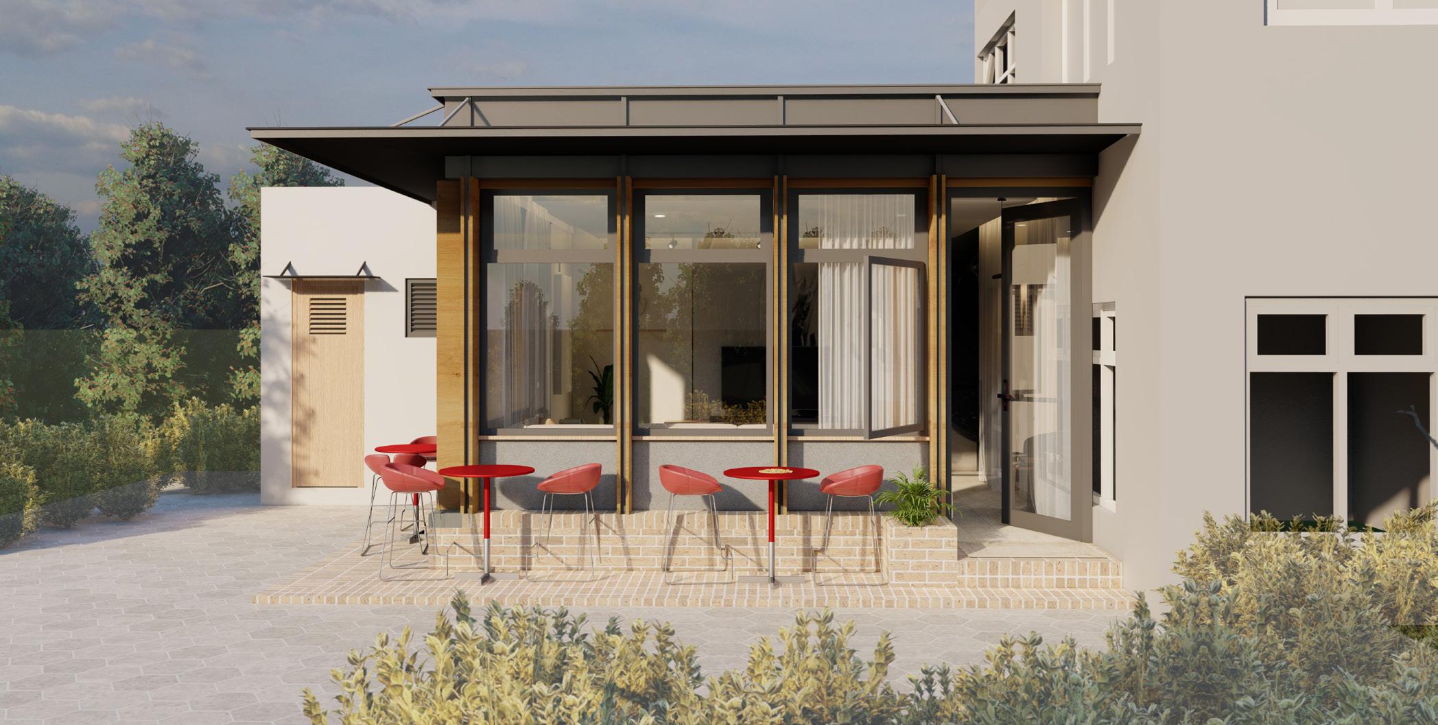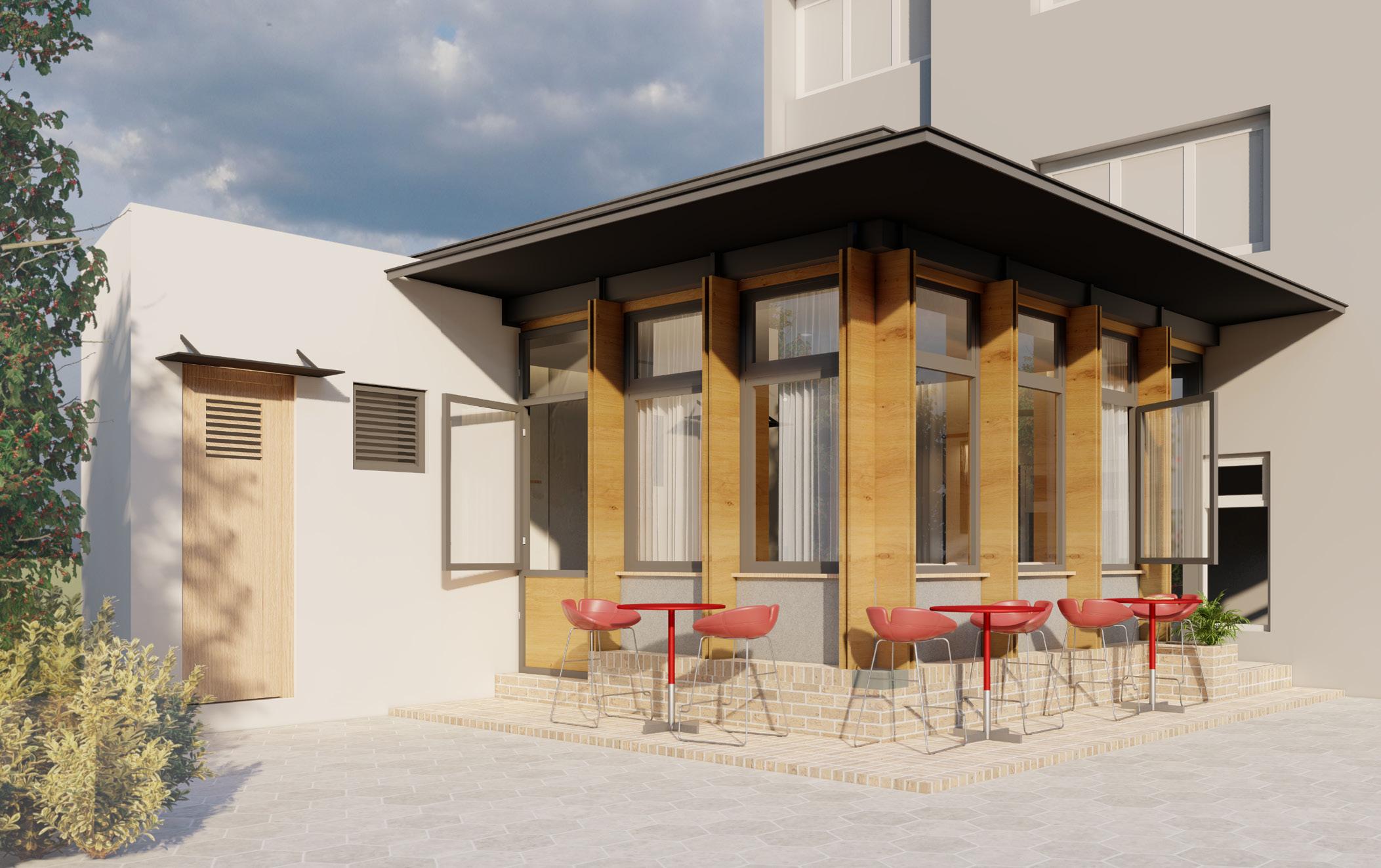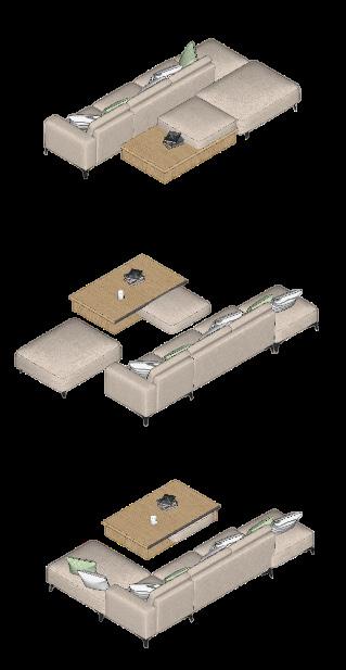An accessory dwelling unit purposed as a living room and an outdoor pizzaria. Acomplimentary blend of metal and wood creating a modern element to the environment. The interior reflects the similar aesthetic. A reconfigurable modular sofa designed to accomodate according to the living room layout and furniture arrangement.