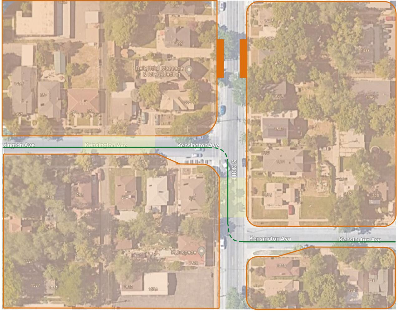 Neighborhood street intersection at 700 E and 1700 S (Dangerous intersection) redesigned for pedestrian, cyclist and driver’s safety.