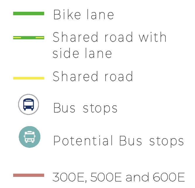 While sidewalks are mostly safe, they could be improved for pedestrian comfort. Public transportation is provided by buses, but there is no direct connection with active mobility, making it inconvenient for pedestrians accessing the five bus stops in the area.