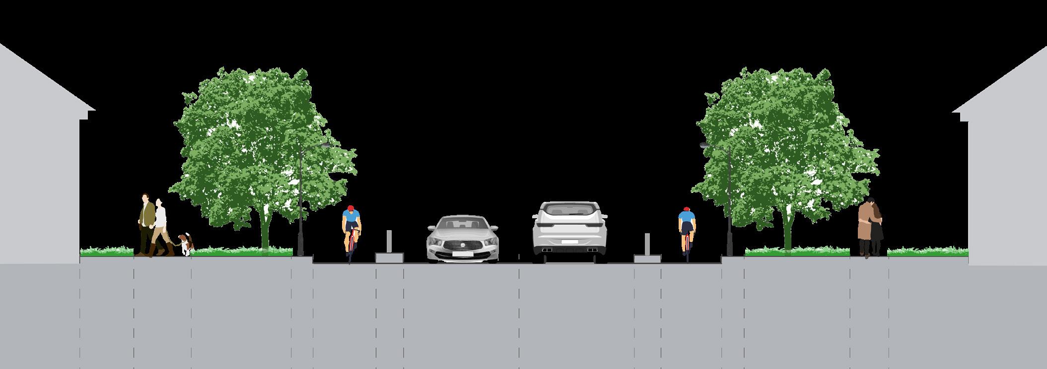 Kenginton avenue byway deflections reconfiguration to standard approach : Utilizing midblock curb extensions also referred to as “pinchpoints” or “chokers” for traffic calming treatment, the green line represents byway route for uninterrupted and low stress biking facility.