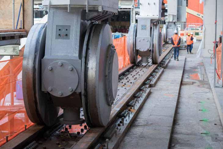 Pre-fabricated walls, platforms, unenclosed steel structure, fully serviced by traveling gantry cranes, floors, stairs, and ceiling modules that were moved and put together by the cranes.
