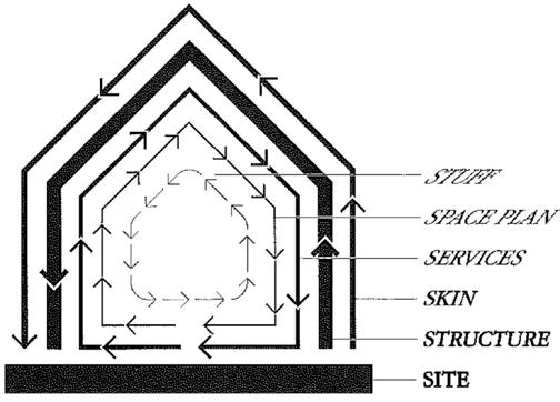 “A building properly conceived is several layers of longevity of built components. The layering also defines how a building relates to people. Organizational levels of responsibility match the pace levels. The building interacts with