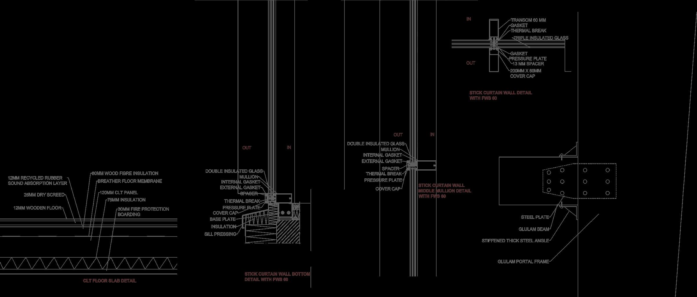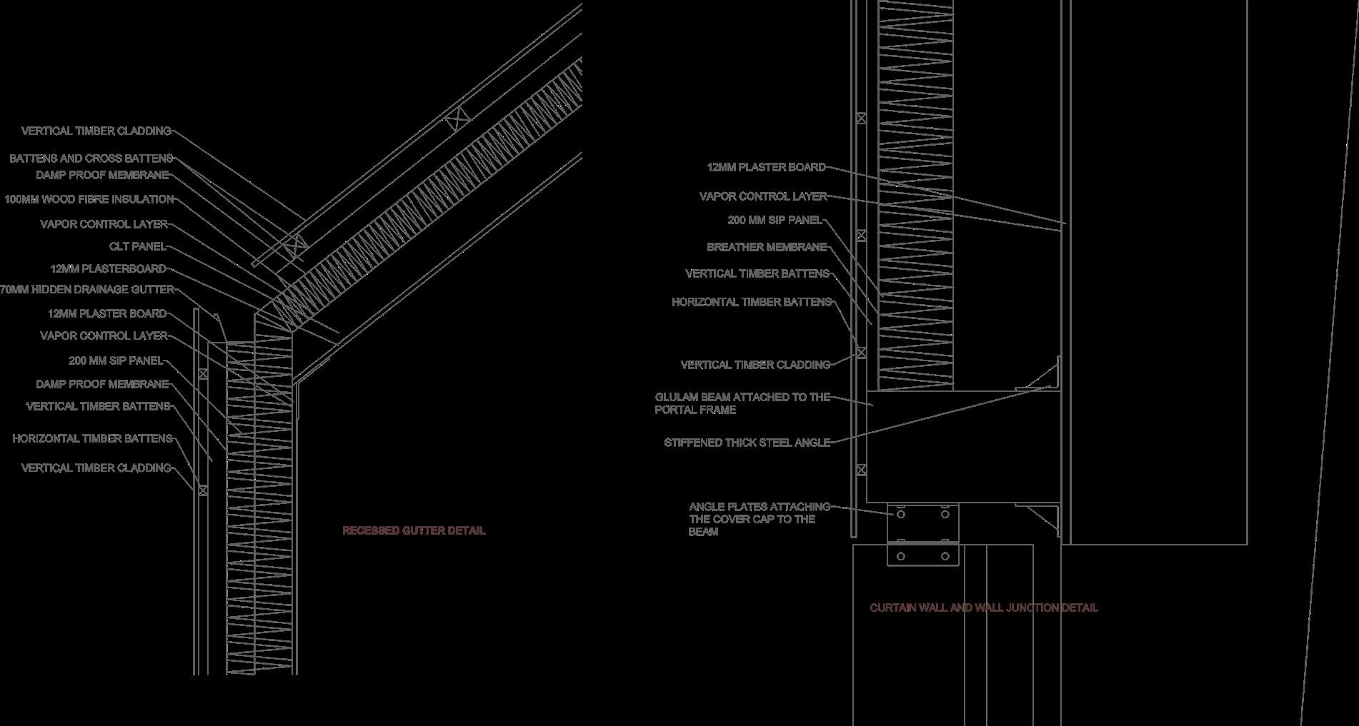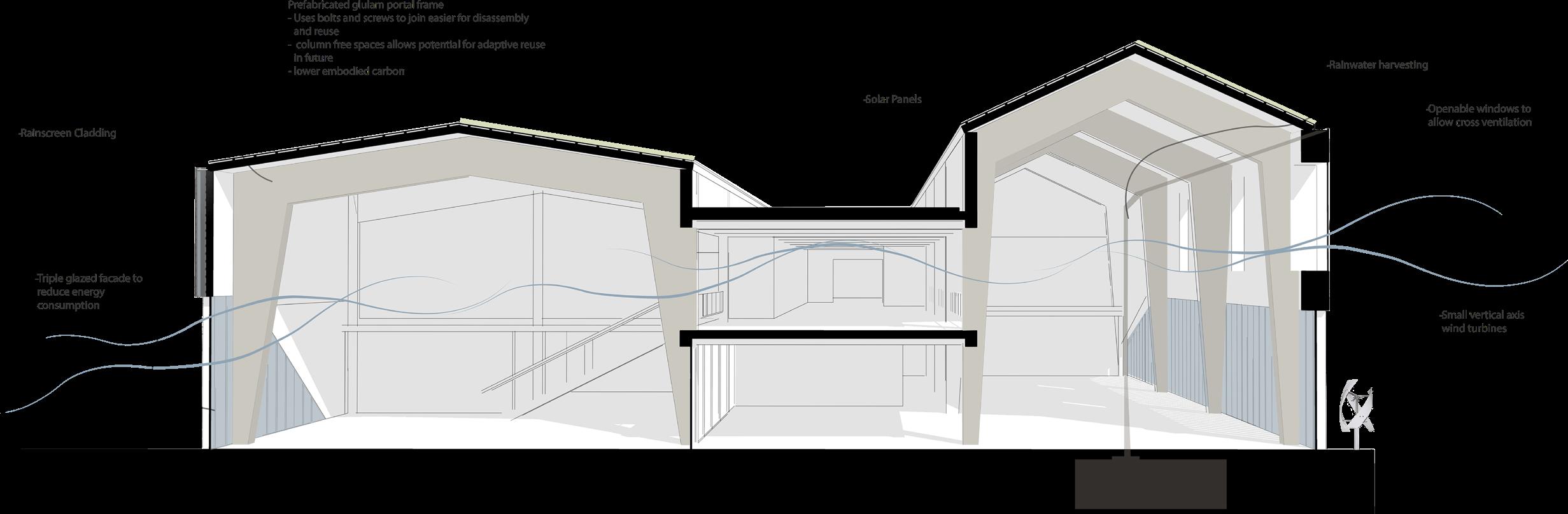 Timber fins are used as a facade element to maintain verticality and a sense of rythm in the building. Here the fins also acts as windposts that support the double heighted structure against the wind loads. Since sports complexes are places having higher humidity using material like timber is suitable as it absorbs moisture and creates healty indoor environment for sports activities. Timber is one of the most ecological building material, it absorbs and stores CO2 throughout its growth process helping to reduce carbon footprint of the construction project. Additionally timber products utilize less energy in production further reducing the overall embodied carbon footpriint.