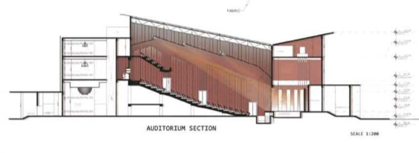 The auditorium is the central element of the Performing Arts Center, designed to reflect the importance of live performance. It features a straight, tiered seating layout that ensures clear sightlines to the stage from every seat. The gradual slope of the floor allows unobstructed views, while acoustically treated surfaces enhance sound clarity and resonance. The stage is slightly elevated and proportioned to support a variety of performances, offering both visual focus and an intimate connection between performers and audience.
