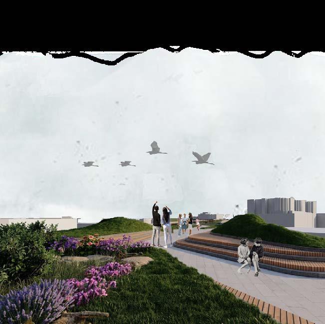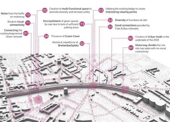 The relics of a city formerly planned with cars in mind will become guiding elements of the blue-green infrastructure. There is an opportunity to answer essential questions about the Future of the city of Berlin in an exemplary way with concepts for the transformation of the former traffic route into a new type of green corridor. The central theme here is adaptation strategies to climate change. On a superordinate level, the entire route to the a 104 between the a 100 and the a 103is to be worked on at a scale of 1:5,000. It is to be examined how the new open space band can be integrated into the network of existing spatial structures and cycle and footpath connections. Sensible connections between tvvvhe climate compensation areas are to be created and potentials that promote biodiversity such as biotope networks are to be taken into account.