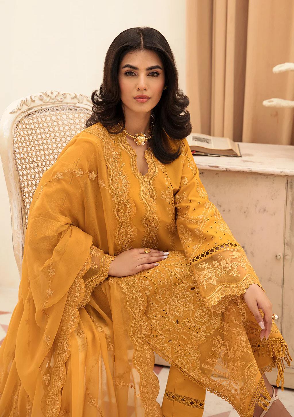 A Women in yellow Pakistani festive lawn suits