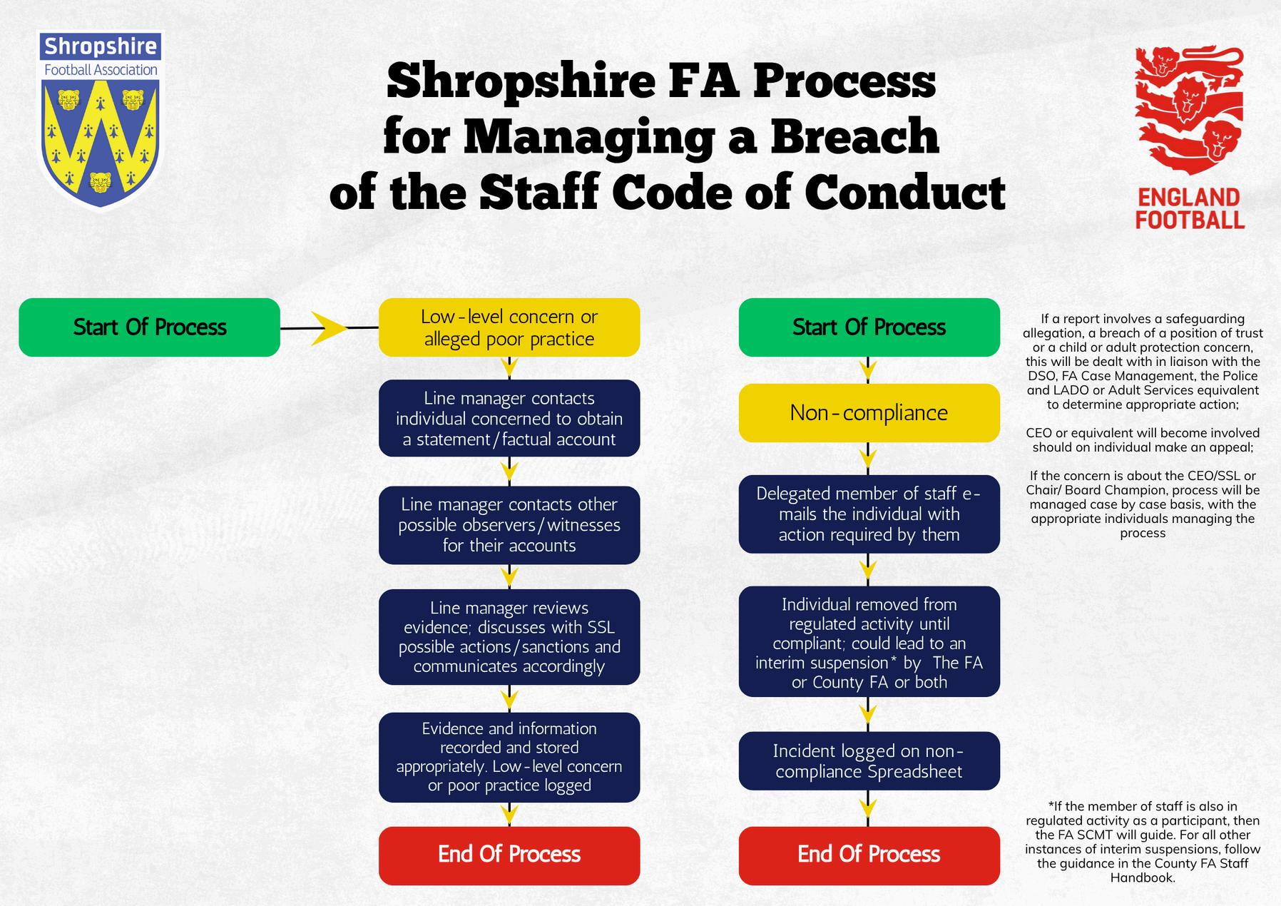 Breaches of the Shropshire FA Safeguarding Code of Conduct are taken seriously, and this process sets out how Shropshire FA will respond in the event of a breach, or a suspected breach