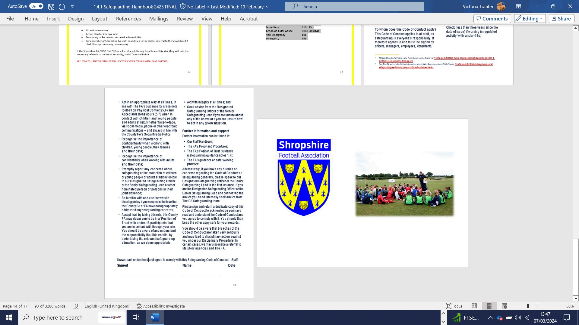 You have signed the Shropshire FA Safeguarding Code of Conduct which states that the wellbeing and safety of all children and vulnerable adults is taken seriously, and that we will act in accordance with the legislation, statutory guidance and The FA’ s Policies and Procedures.