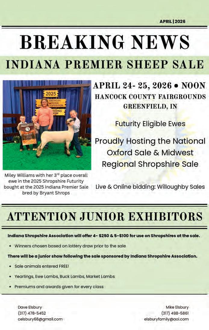 `The 2026 National Shropshire Sale will be at the Ohio Showcase Sale in Greenville, Ohio on May 7-9. The Indiana Premier Sale will be April 24-25 in Greenfield, Indiana.