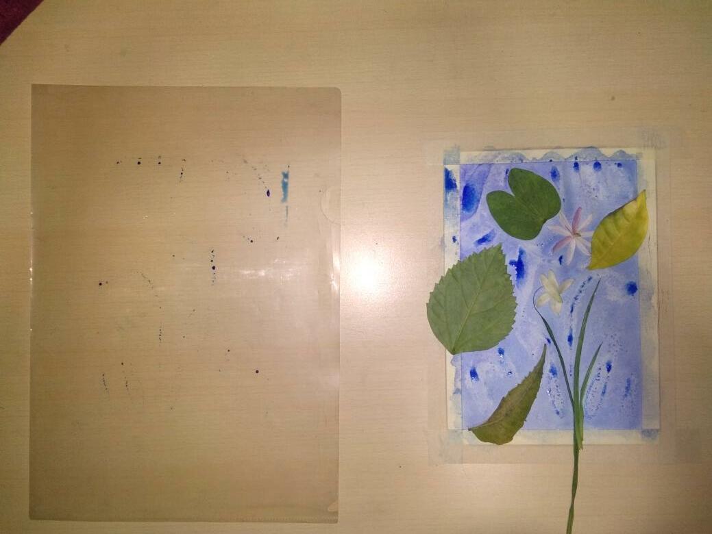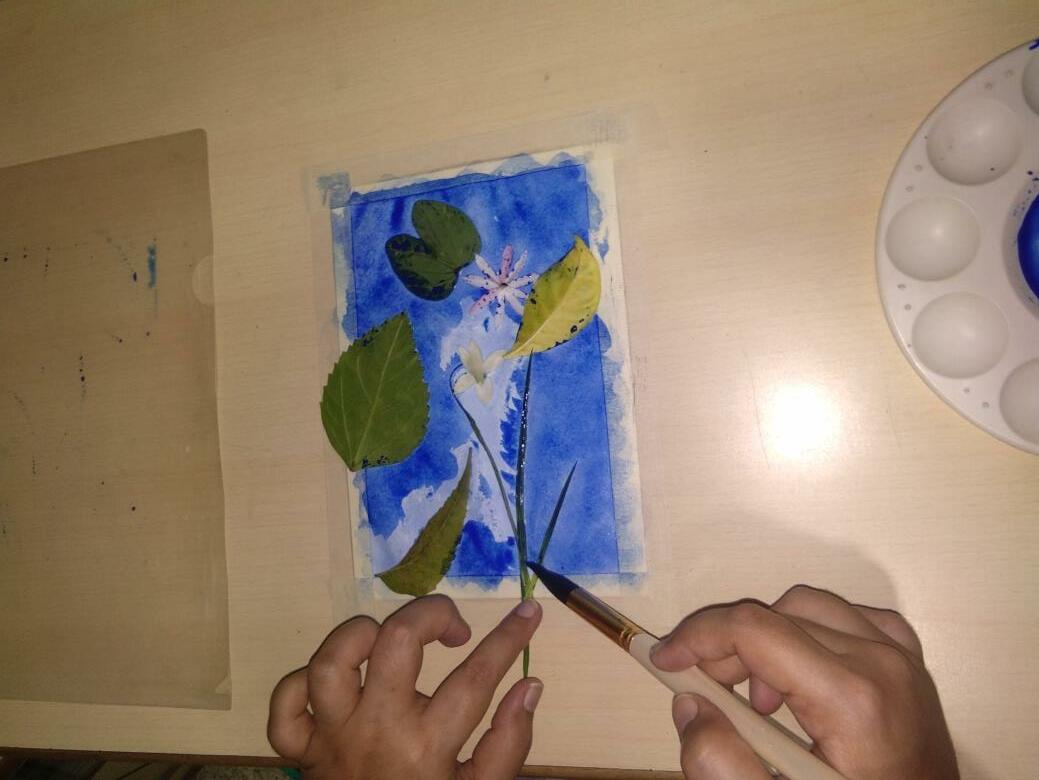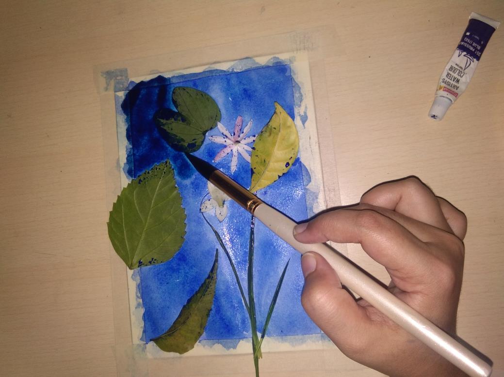 Give a wash to the entire paper Then place all the leaves and flowers according to the layout made earlier.