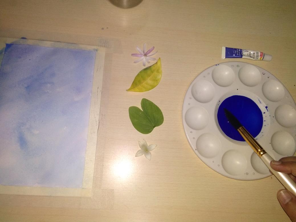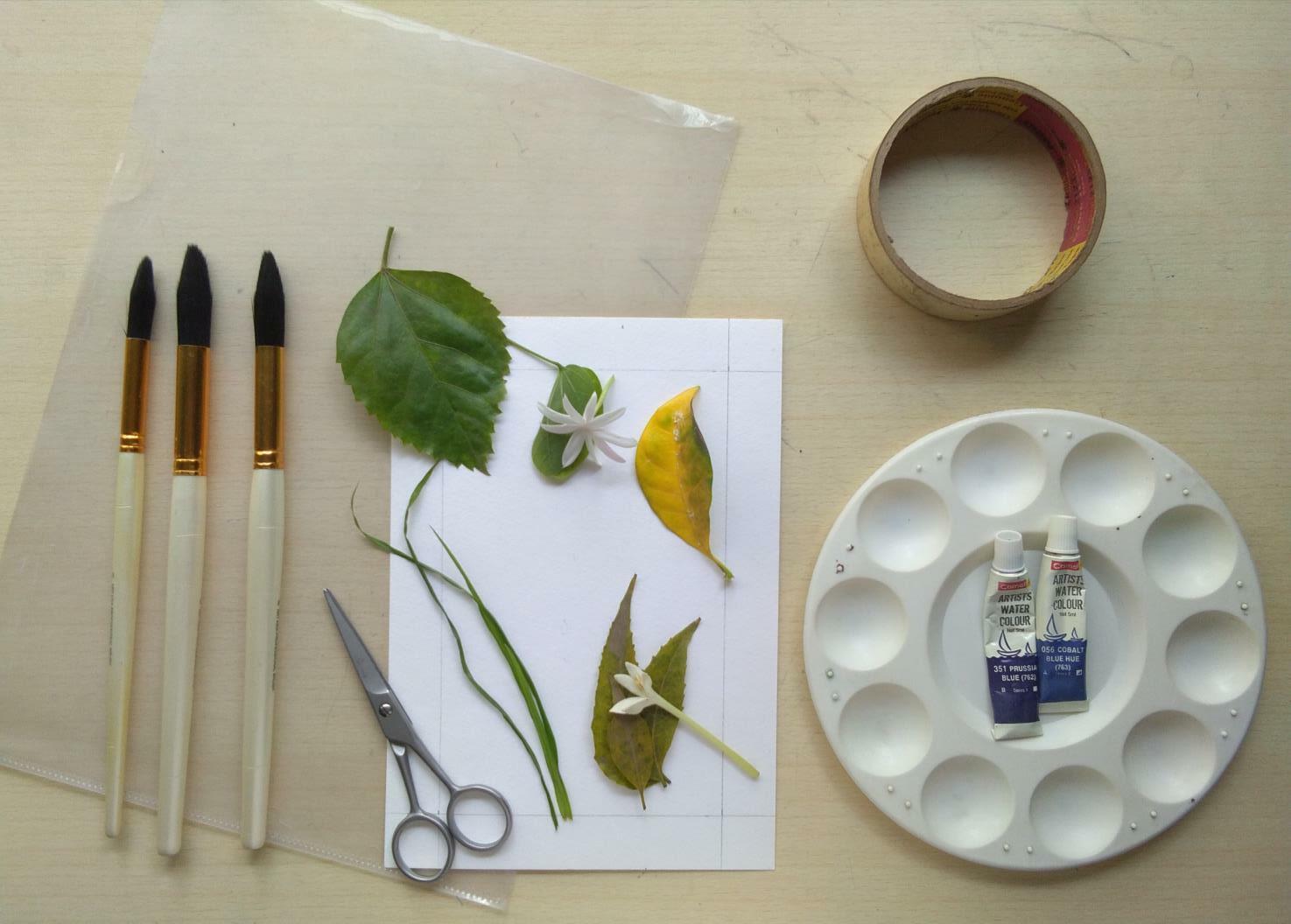Materials Needed Masking tape Plastic sheet Paint Brushes Leaf, flowers and grass of your choice Scissor Painting paper Palette Two or more shades of blue watercolor paint