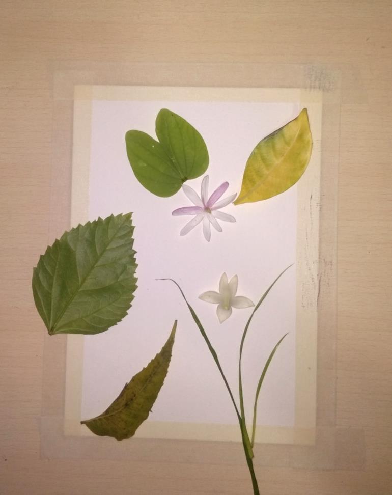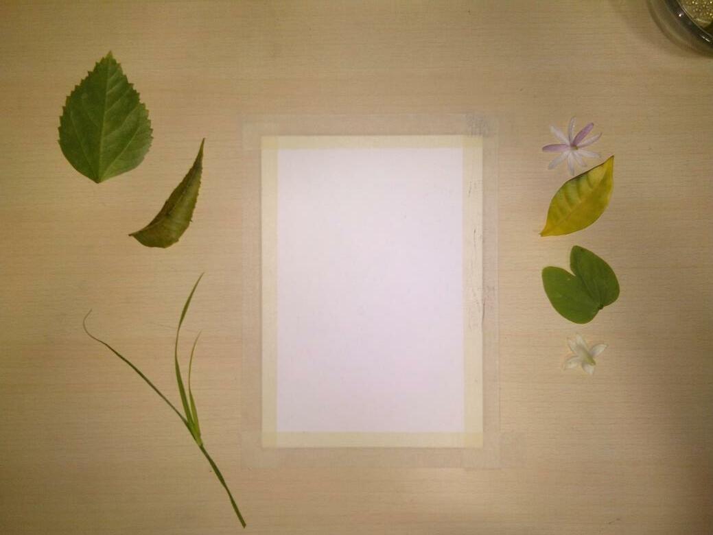 Tape the paper and place the flowers, leafs and grass on the paper and create a layout of your choice.
