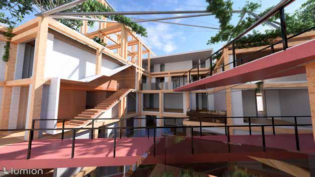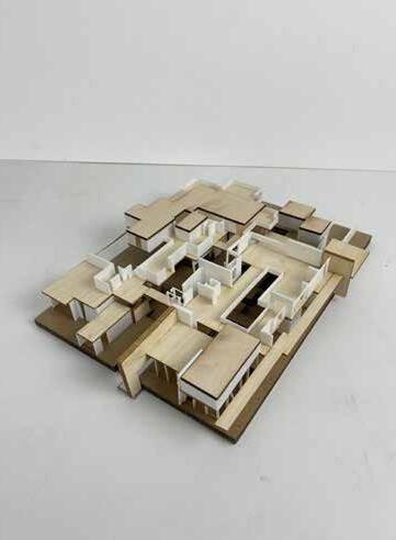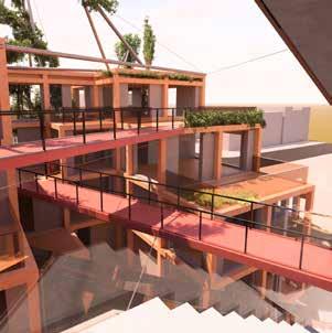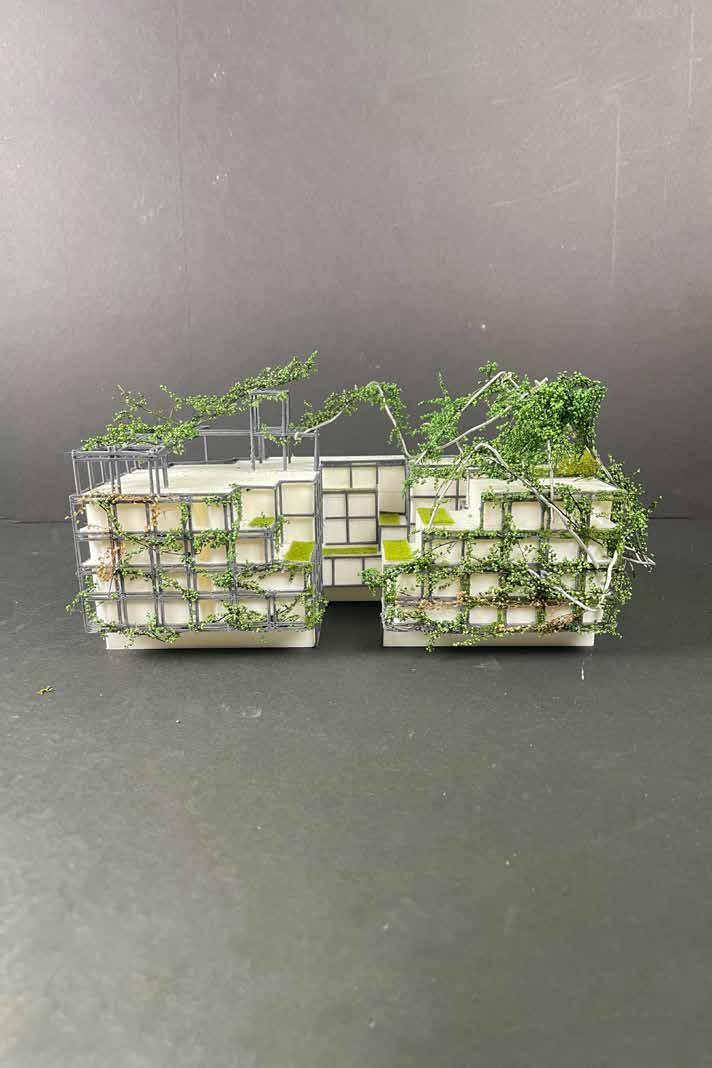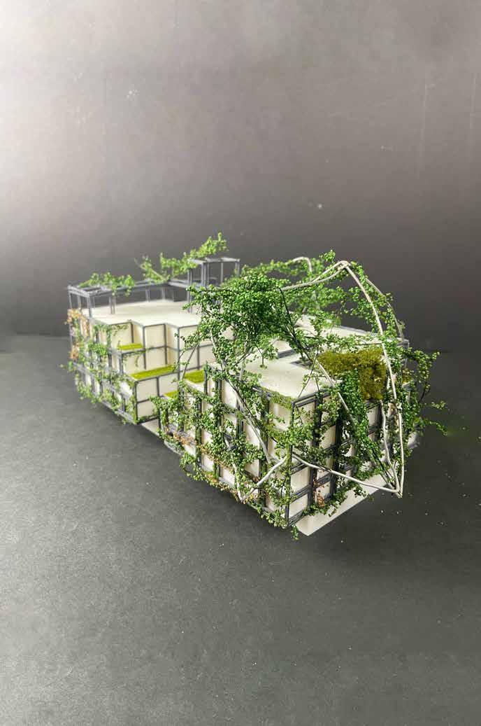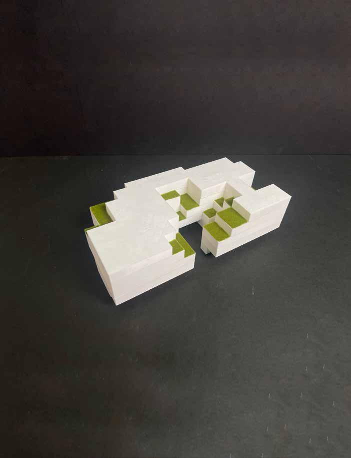 In my Comprehensive Design 302 class, I collaborated with my partner Tvishaa Chadha on the of the Multi-Generational Co-Housing Project. This project reimagines urban living by integrating green spaces into both private and public realms. Inspired by the pixelated modular approach, each floor features unique subtractions that introduce communal gardens, fostering a connection to nature for residents of all ages. The design emphasizes vertical expansion and community interaction, with modular courtyards linked by bridges supported by glulam beams. A rooftop ecosystem crowns the structure, serving as a living space for both residents and local wildlife.