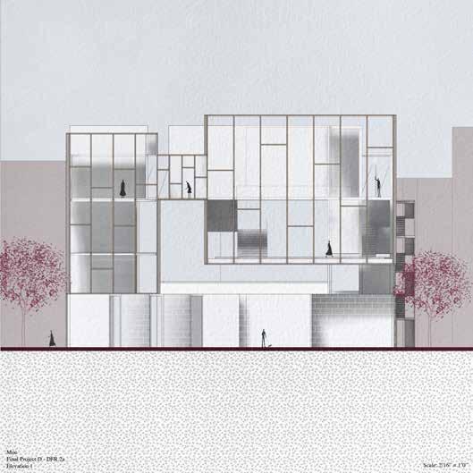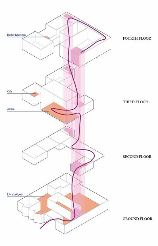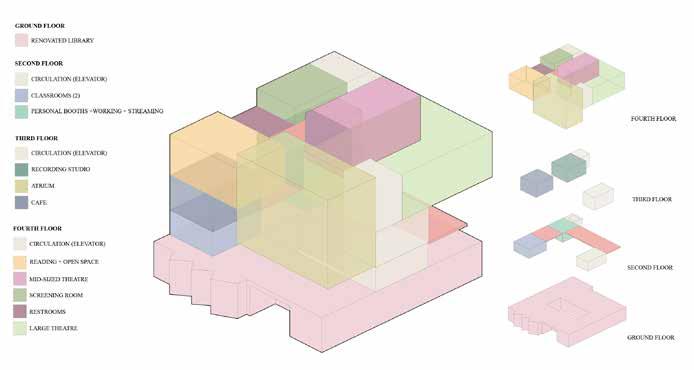 In my Intermediate Design 202 studio project, I focused on transforming the Marcy Library in Brooklyn. The vision was to expand and revitalize it into a state-of-theart Audio-Visual Center, complete with classrooms, theaters, an atrium, and an enchanting outdoor garden. Central to my design concept was the harmonious integration of nature with contemporary, blocky architectural forms. This is exemplified by the inclusion of an open atrium, a serene garden at the heart of the structure, and smaller green spaces encircling the rooms, creating a blend of natural elements within a modern setting.