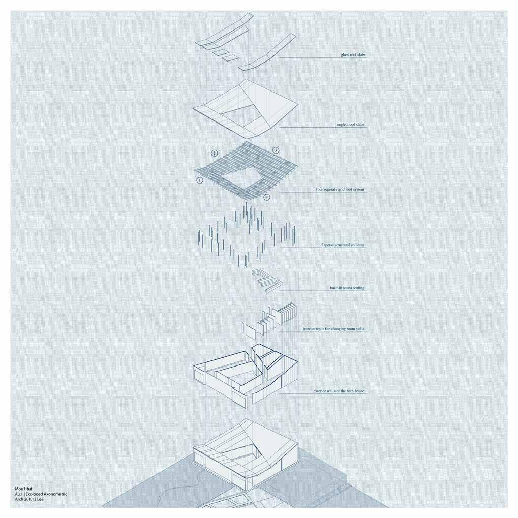 In my Intermediate Design 201 course, I undertook the creative task of designing a civic sauna and bathhouse. This project was inspired by the architectural style of Junya Ishigami’s KAITS Workshop, especially its two-way slab roof system. Central to my design is an open garden, seamlessly integrated into the heart of the structure, adding a touch of nature and tranquility to the bathhouse environment.