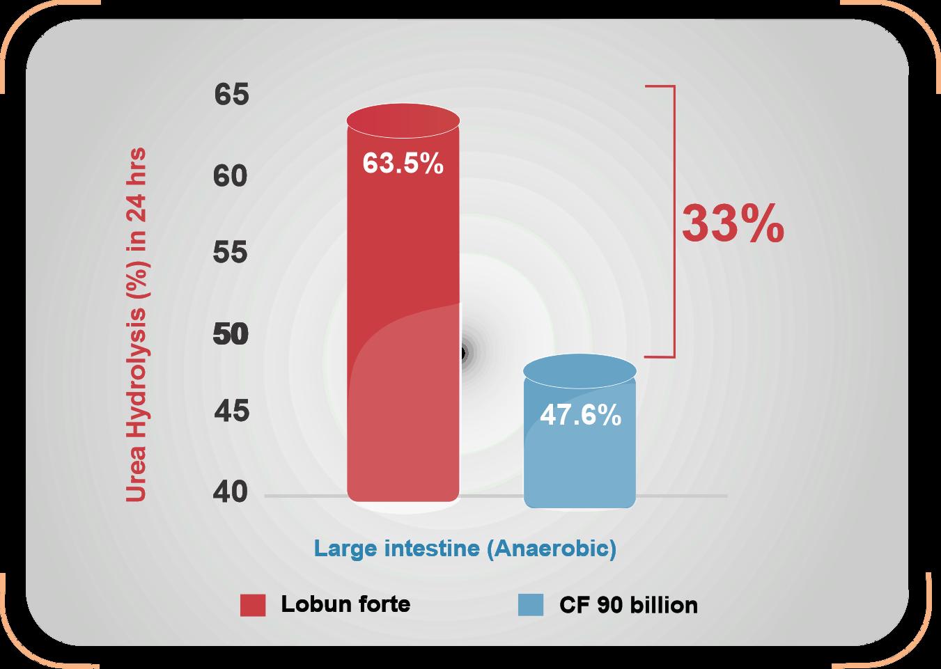 NLT 45 Billion CFU reaches intact the target site & multiplies for the next 10 – 12 hrs with twice daily dose helps to lower circulating toxins in CKD patients