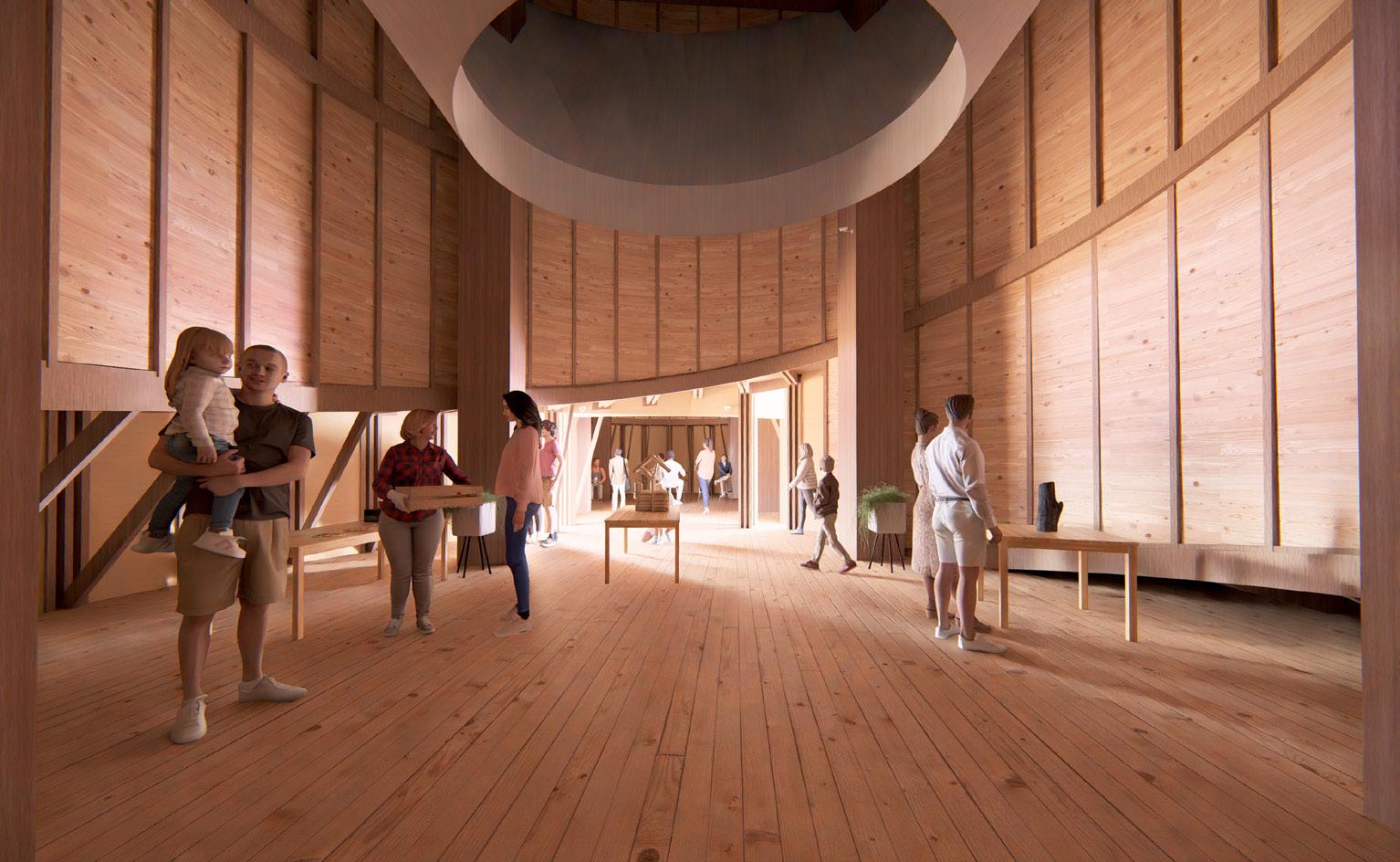 More than a mere viewing tower, the Timber Tower serves as an interpretive space—an architectural homage to industrial memory. Semienclosed, curved timber walls guide the ascent, recalling the cylindrical interiors of grain silos, while strategically placed openings frame views towards significant historical structures.