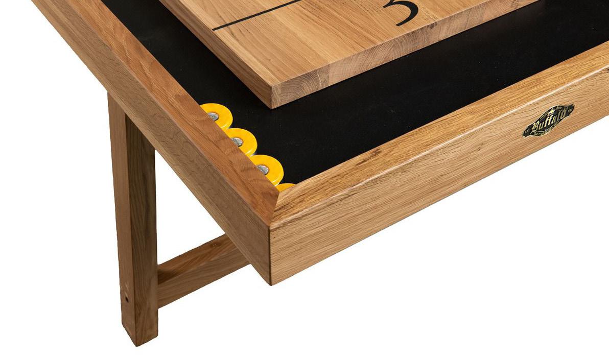 Optionally, a shuffleboard cover can be provided. This allows you to use the shuffleboard as a dining table or buffet table. This cover can be made of black plywood or lacquered solid oak.