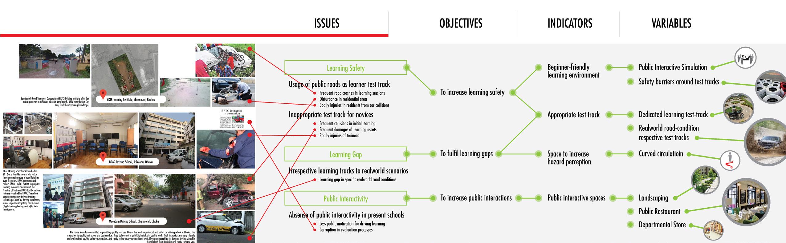 There were 362 driving training schools and 418 driving instructors in Bangladesh in 2012. Of these instructors, less than 108 had a legally required instructor’s license. Moreover, the present driving schools situated in various locations throughout the countr y lack ver y primar y features and infrastructures to provide quality education to the trainees. This condition of learning leads the way for our development and quality of life to go downward. This research is intended to provide a recover y of the driving learning environment. The primar y aspiration of this research would be to distinguish spatial and built determinants that are responsible for stagnating the learning ambience of motor driving.