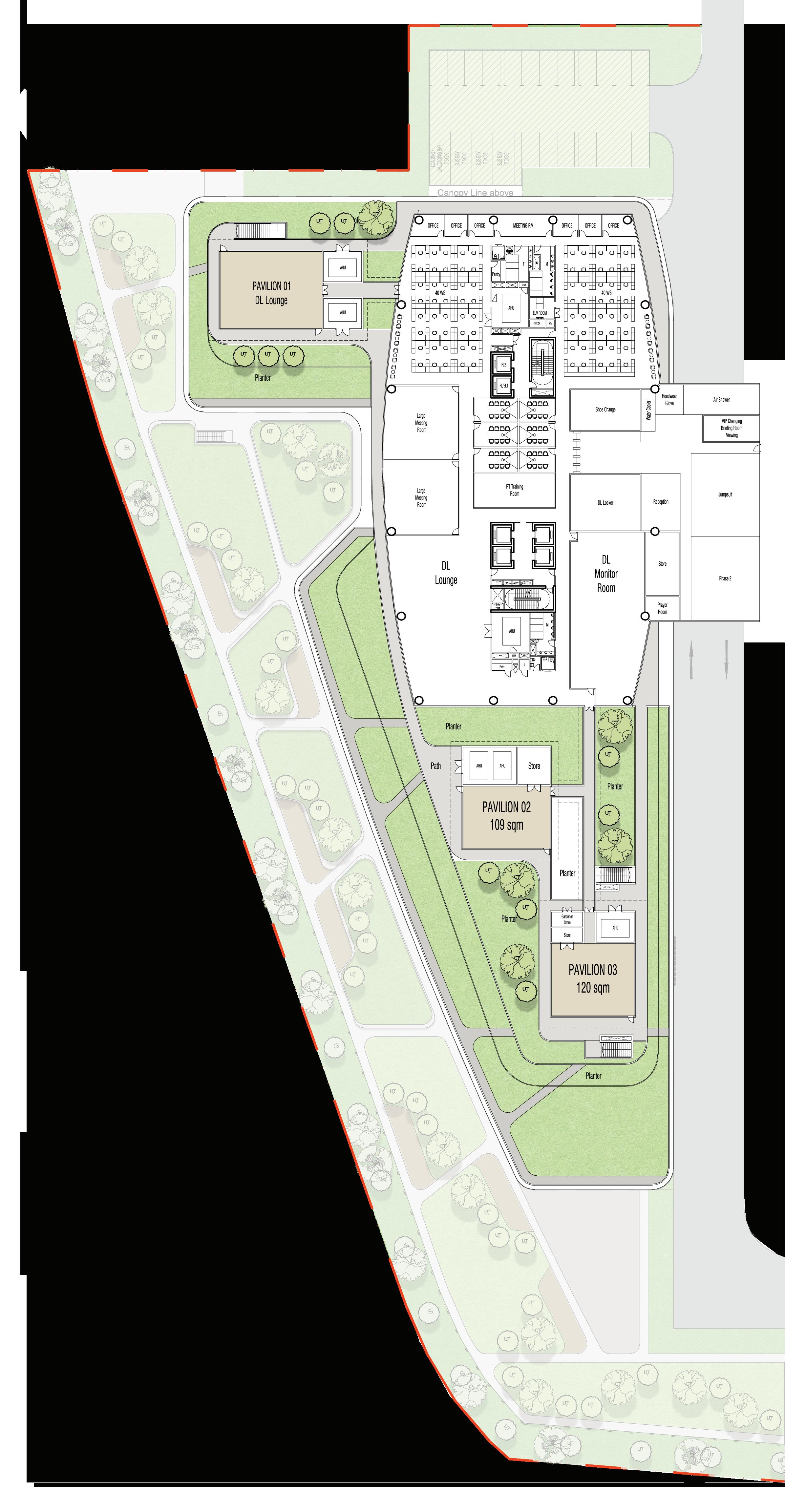 L1 Lush Landscape Staff Wellness & Recreational L4 Elevated Garden Multipurpose Glass Pavilions L8 Column-free, optimised floor plan for natural light penetration RF Cascading Roof PV System Legend 1. Staff cafeteria 2. Cafe 3. Gym 4. Sports Court 5. Clinic 6. Pavilion