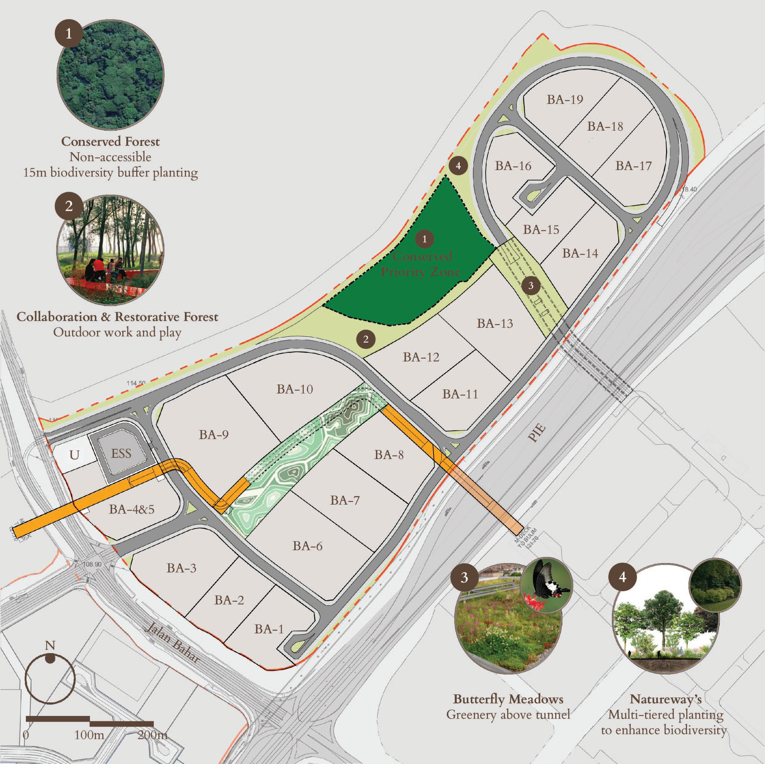 As such, the following measures are proposed and are currently being studied. Land parcellation was adjusted to retain priority zone 1 and maintain a proposed 25m buffer where a 15m width multi-tiered vegetation consisting of bird and butterfly attracting trees and shrubs is introduced to reduce forest edge effect.
