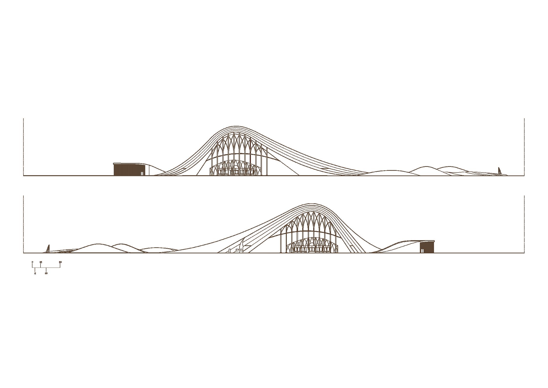As the arch structures cascade down to the ground, a series of landscape strips shaped like ribbons will flow outwards towards the entrance. This is to create a seamless look where the arch structure blends into the natural surroundings.