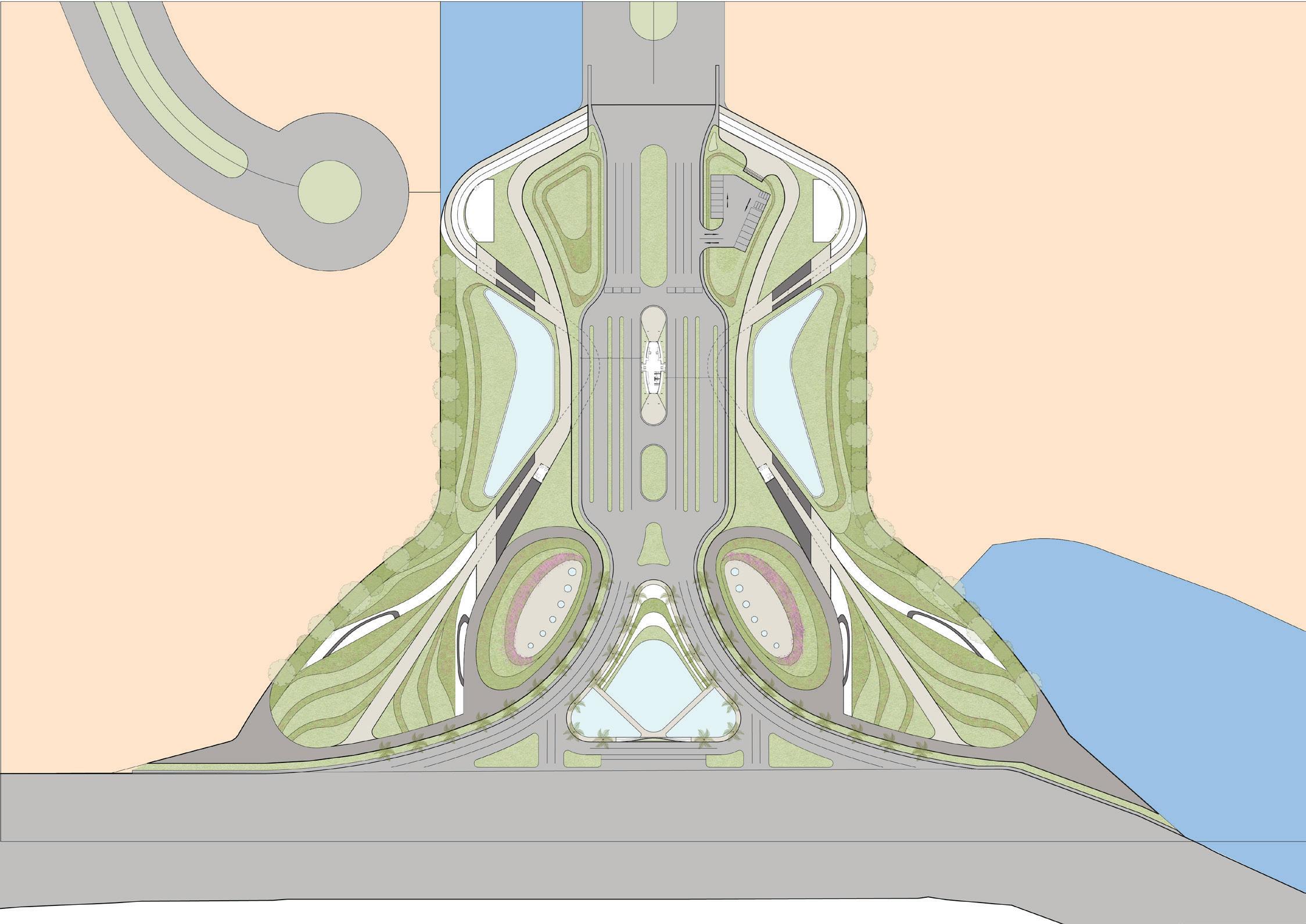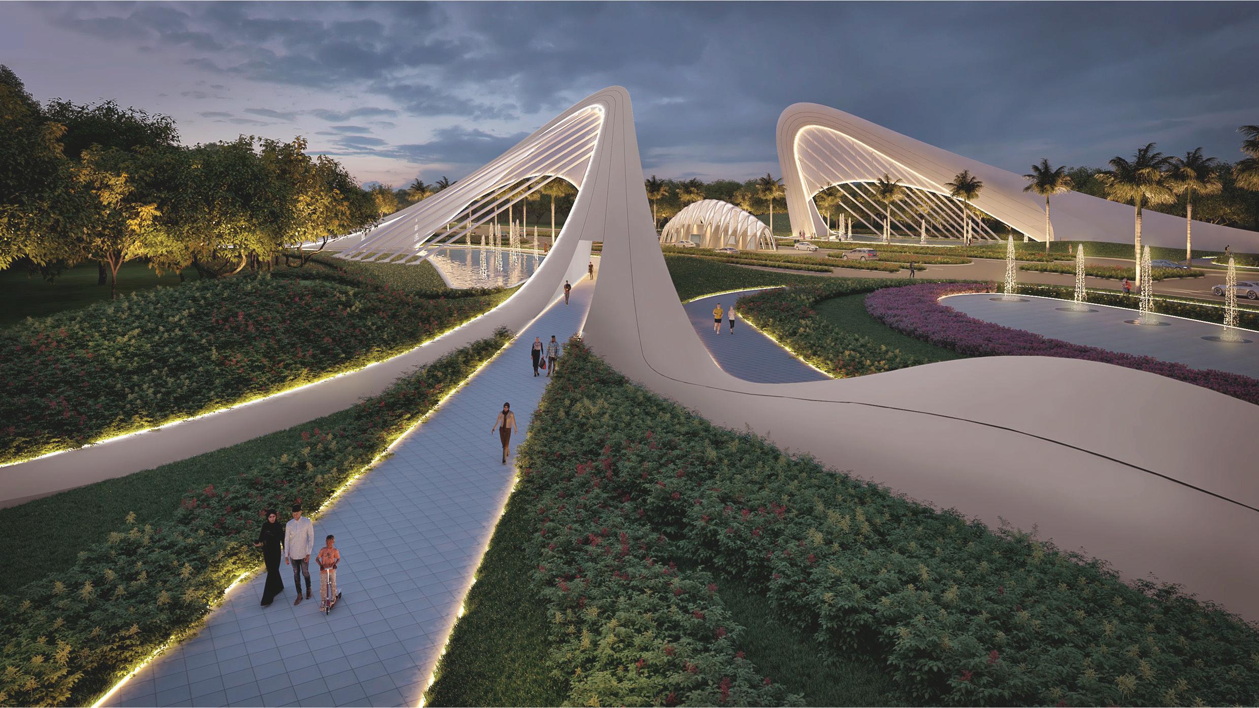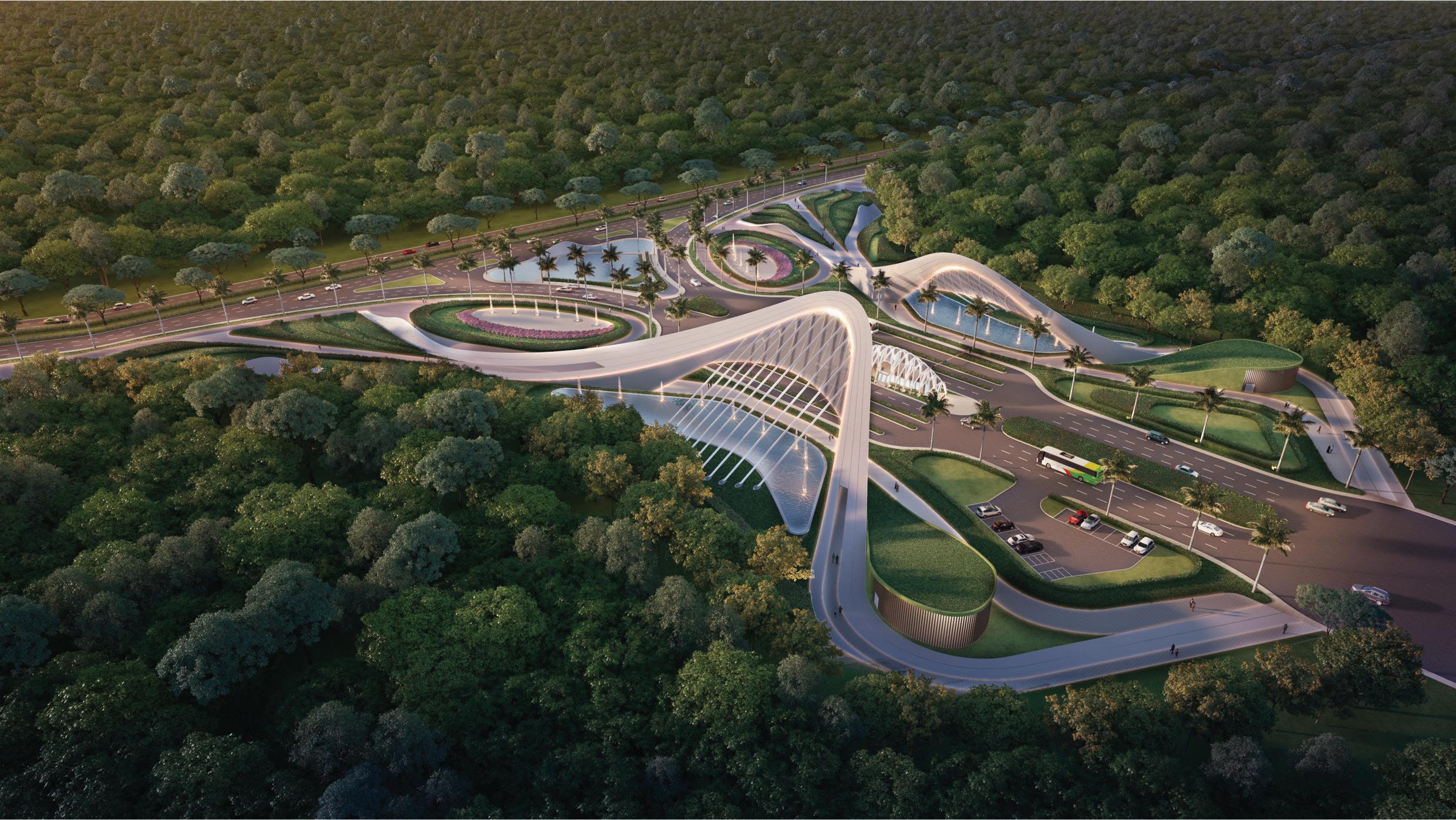 The gateway emerges from the landscape in the form of a continuous ribbon that weaves through lush greenery before extending upwards to form an arch structure at the apex that frames the entrance. The two arch structures and its underlying motif screen is supported by metal bracings that rise above the water body. The continuous ribbon provides seamless wayfinding into the city and serves as a pavilion shelter at key meeting points.