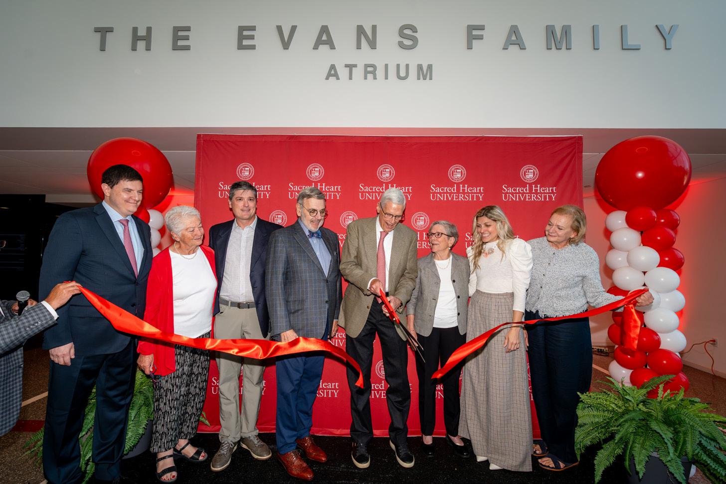 At the ribbon-cutting ceremony held for the newly named West Campus Atrium, SHU President Dr. John J. Petillo, board members, faculty, students and members of the Evans family gathered to celebrate this milestone. Petillo, Sutera and board member Mary-Ann Bunting all spoke about the Evans’ commitment to education and service.