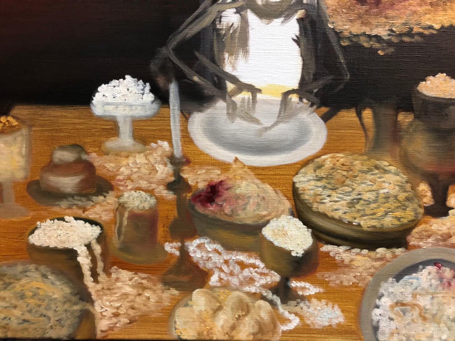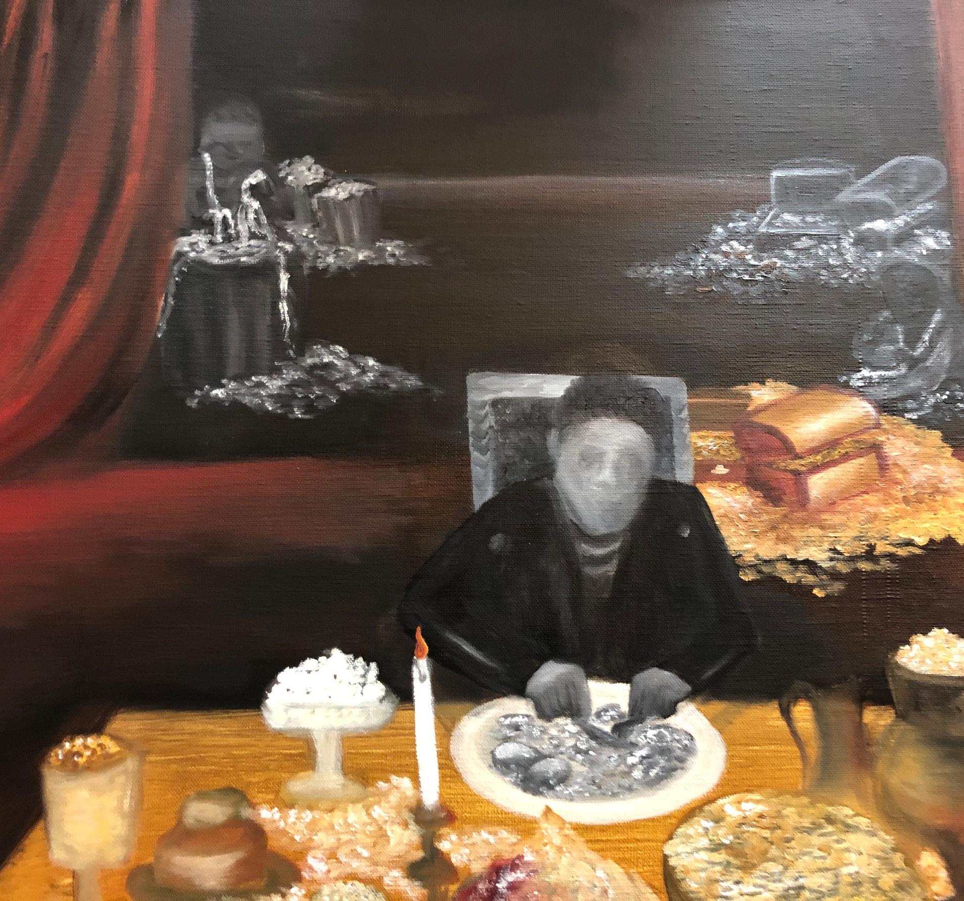 inspiration for this painting is always greed, always with the pattern of money, and people’s desire for money is endless; the central benevolence and western background are in black and white, and the gold and silver jewelry at the front are gold coins The agreed pur pose can be used.