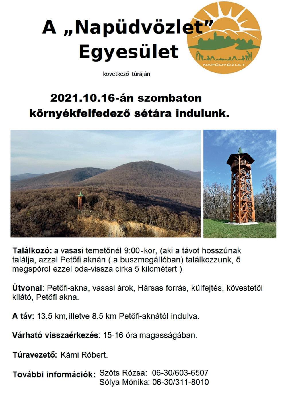 Ezért arra gondoltunk, hogy az egyesületünk következő túráját an nak jegyében hirdetjük meg, hogy ebben segítséget nyújtsunk. Várjuk tehát azokat a nemrég ide költözött „gyüttmenteket”, akik még a kör nyék felfedezésében támogatásra szorulnak, vagy egyedül nem indul nak útnak. Várjuk azokat a „tükéket” is, akik már jól ismerik a közeli ösvényeket, látványosságokat, és tudnak információkkal, anekdotákkal szolgálni. A túrák kiváló alkalmak a kapcsolatteremtésre, ismerkedés re, közös értékek felfedezésére. Képzett vezetőnk, Kámi Róbert mindig elkápráztat bennünket olyan ismeretekkel, történetekkel, melyektől gazdagodunk. Ahogy azt a 11. oldalon lévő plakáton is megjelenítjük, október 16-a lesz a nap, melyen reggel 9-kor találkozunk a szokásos helyen, a vasasi temető előtti parkolóban. A táv 13,5 km. Aki ezt hosz szúnak találja, azzal Petőfi-aknán (a buszmegállóban) találkozunk, ő megspórol ezzel oda-vissza cirka 5 kilométert. A túra érdekessége lesz, hogy a Kövestetői kilátóból leereszkedünk az elhagyott fonolitbányába (melyről a túravezetőnk részletesen mesél majd), a kilátóból pedig re mekül betájolhatjuk szűkebb hazánkat és a környező hegyeket, völgye ket. Ha a várt kiadós eső is megérkezik, a gombák csodálatos világával is ismerkedhetünk, ebben a vezetést magam vállalom.