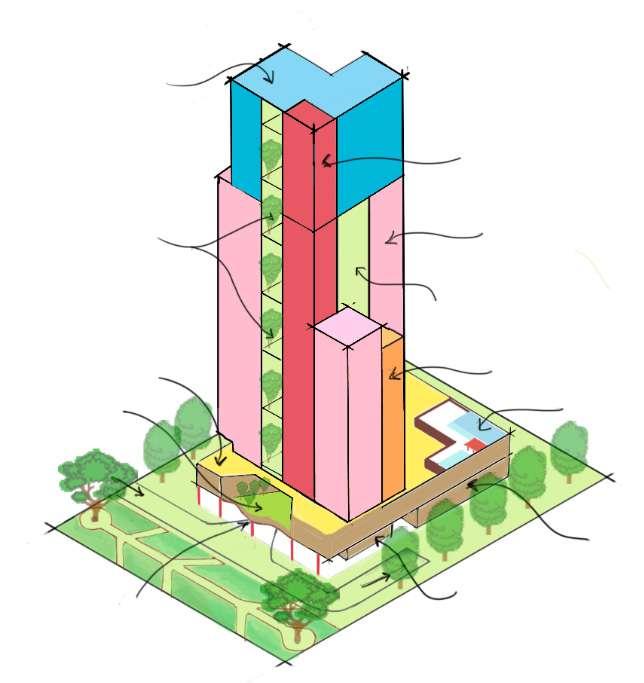 The main focus was to design a stucture that is sustainable, eco nomic and climate responsive. The City is loosing it’s architectural language as the structures today are so rigid and controlled by the concrete walls. The build ing are becoming climate controlling and not climate responsive. Hence, the design focuses on creating a ladmark with keeping in main the climate and the Architectural language of Mumbai.