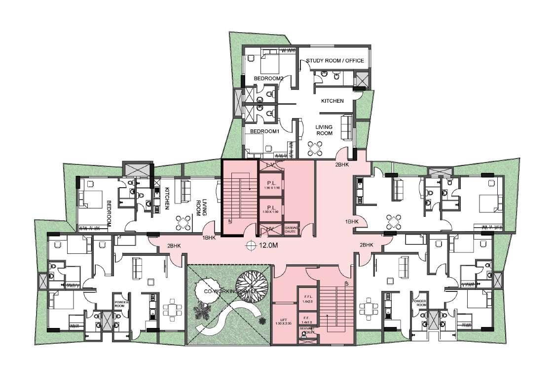 10 1. VERTICAL CIRCULATION LOBBY SPACE 2 BHK APARTMENT 1 BHK APARTMENT SWIMMING POOL INDOOR GAMES AREA CAFETERIA AND SERVICES DROP OFF CANOPY WITH OPEN RELAXING AREA OPEN TO SKY AMENITIES INTERMIDIATE COWORKING AND LOUNGING SPACES 3BHK APARTMENTS ENTRY 2. 3. 4. 5. 6. 7. FORM DEVELOPENT AND MASSING