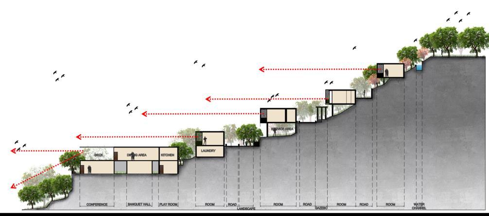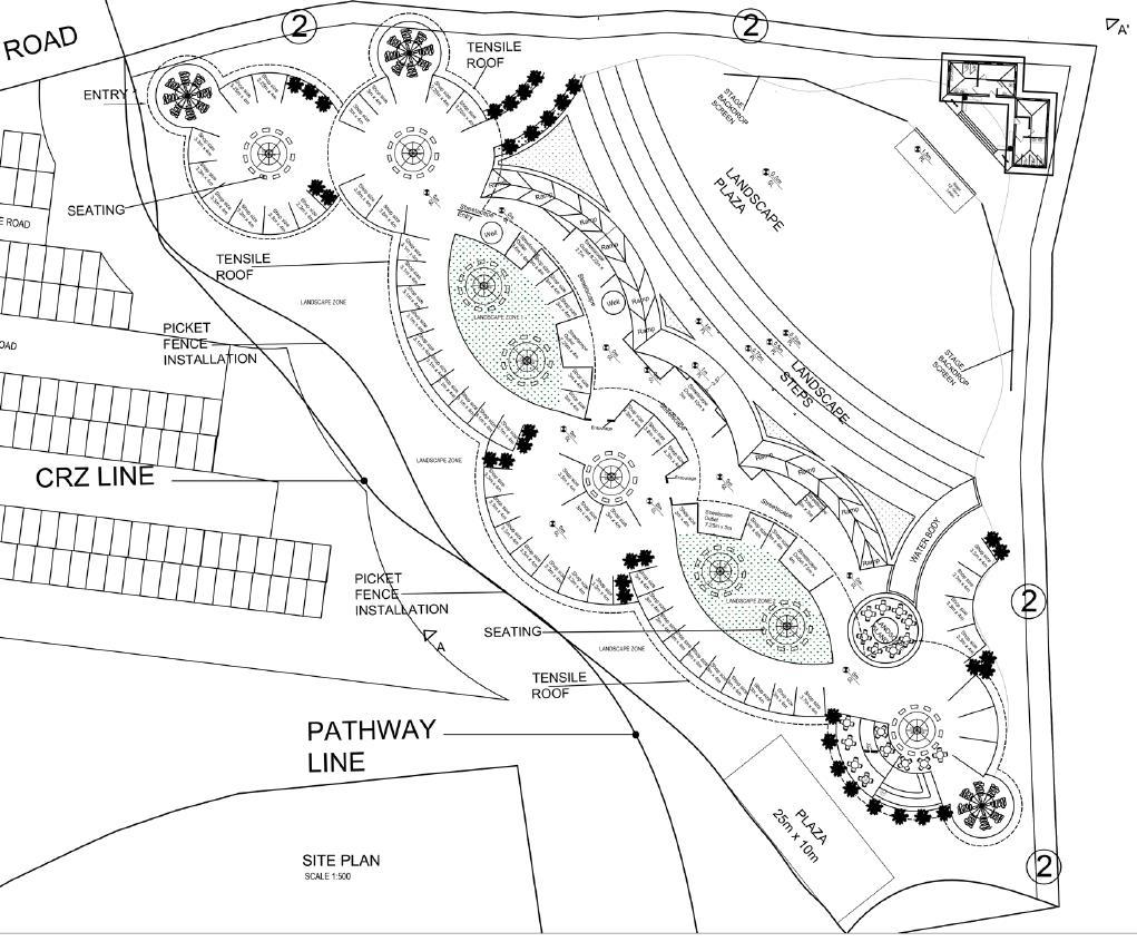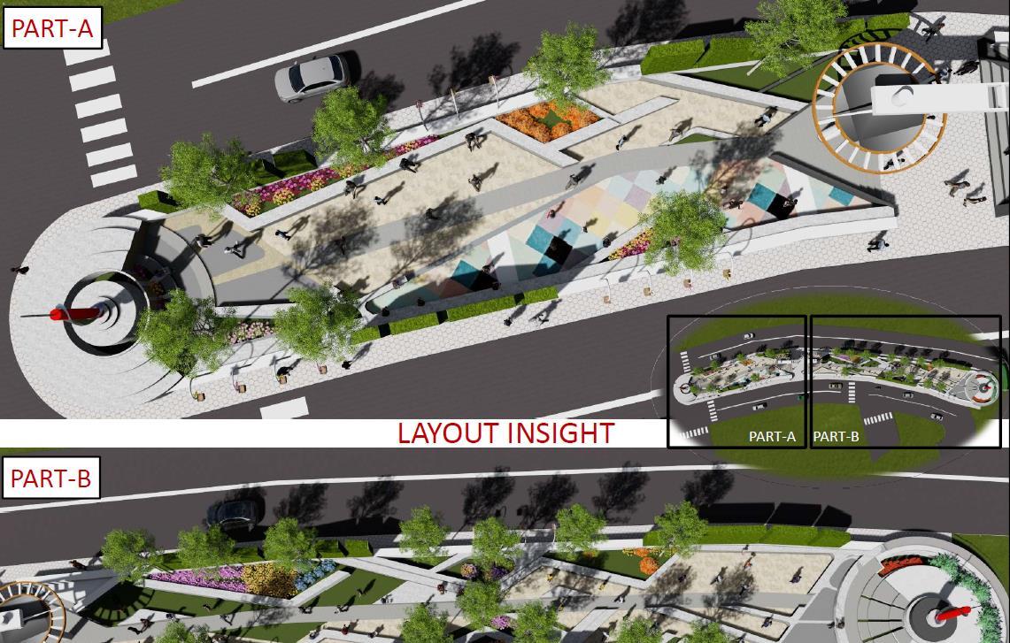 The layout design has been conceptualized on the modernistic approach on the basis of intersecting lines, which creates triangular multiuse spaces. These alternate spaces acts as pockets which helps in the easy mixing of people and nature..