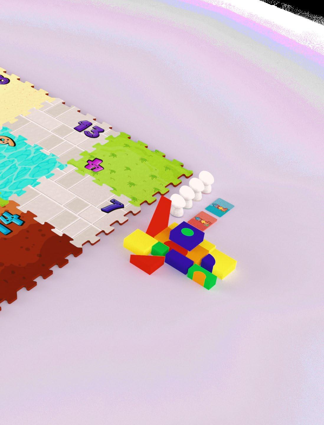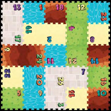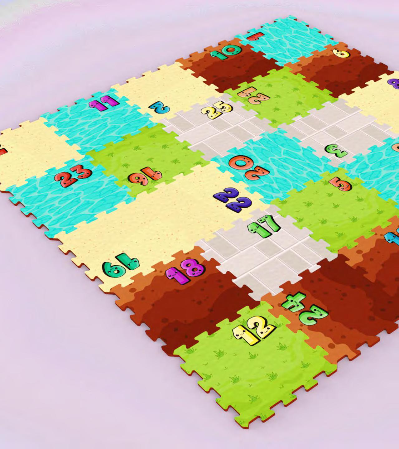 25 pieces of puzzle mat in a set of the toy. The mat is printed with numbering and different landscape: soil, sand, water, grass and concrete. No rules and sequences when assemble the mats.