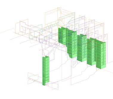 The use of a digitally drawn 3D model allowed for a series of varying possibilities and outcomes in spatial identification, helping to narrow down informed decisions on the spatial components and ordering of the model. This process revealed how individual spaces compare in relation to each other and to the model as a whole, leading to a more comprehensive understanding of the building’s spatial components and relationships.