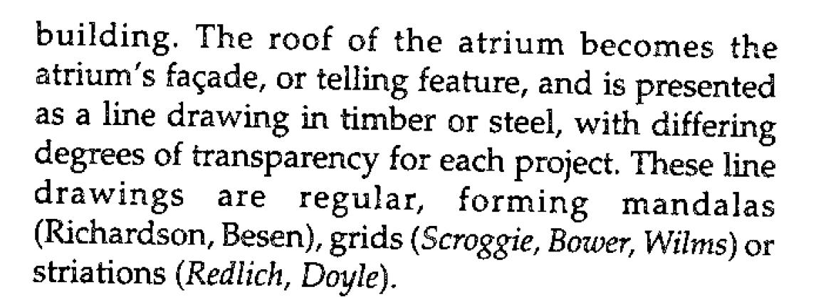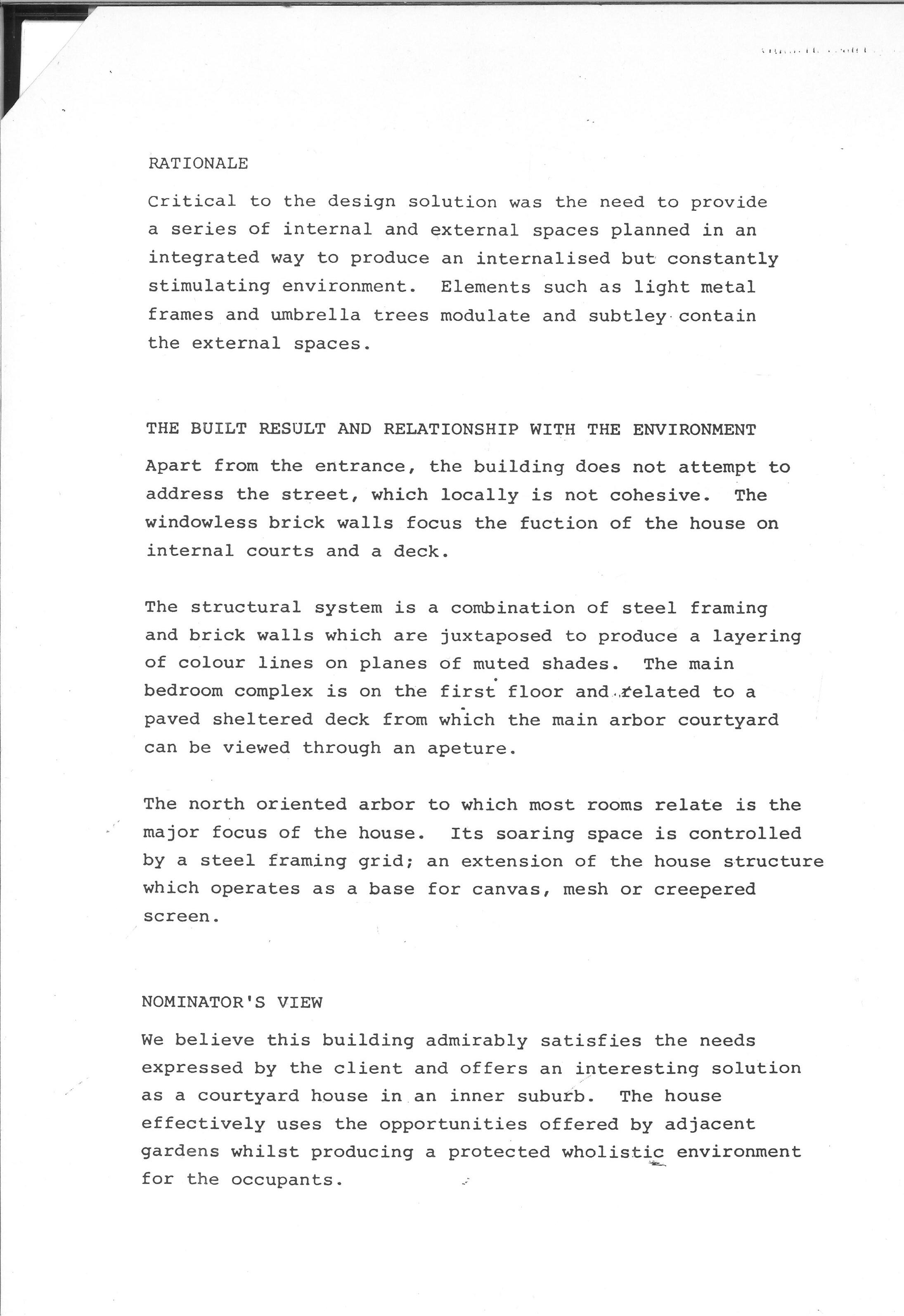 For all my career I have explored the integration of useable open space as an adjunct to those spaces within buildings. This exploration is exemplified in a number of seminal houses in both urban and rural locations. Examples are: