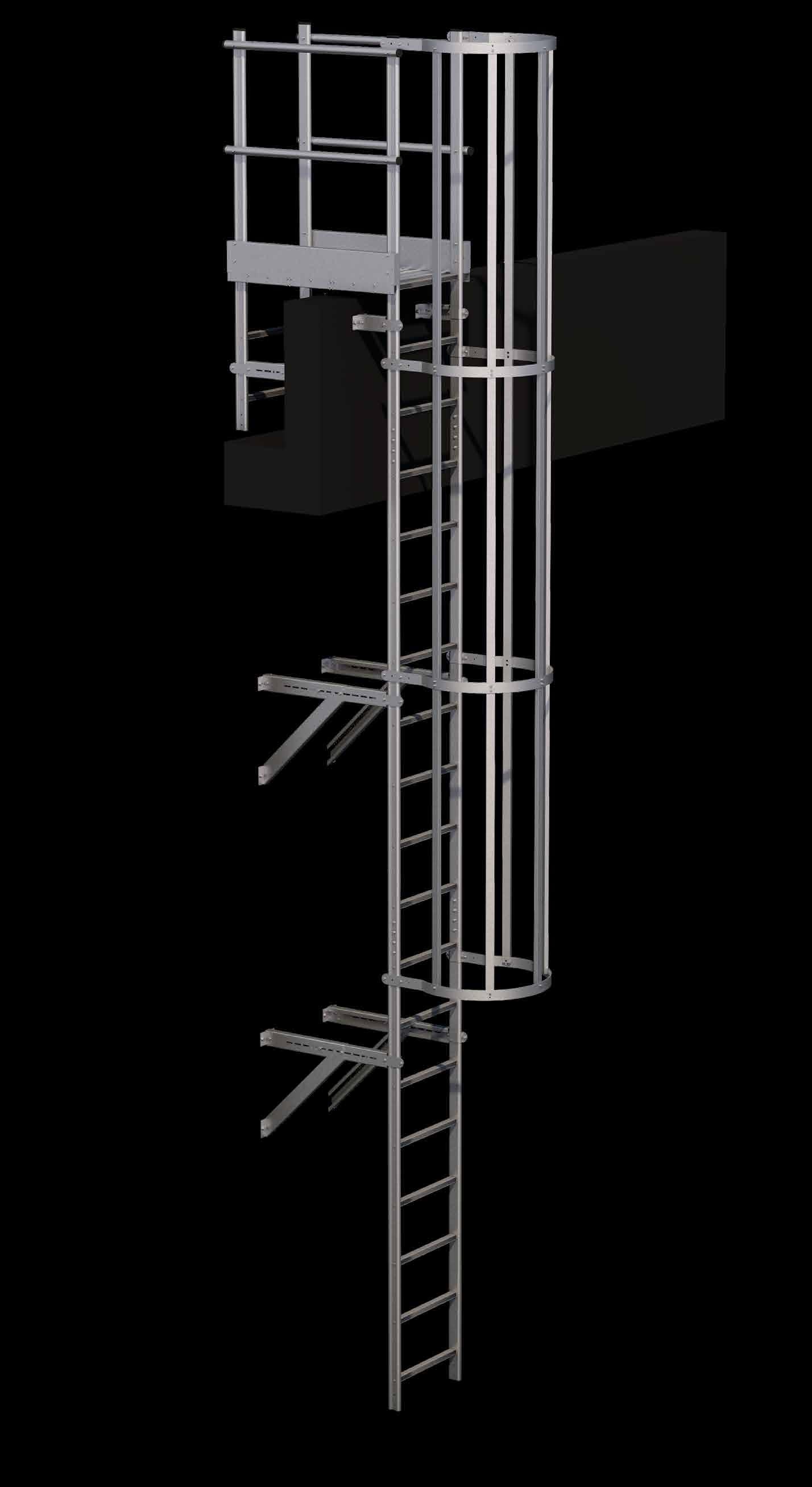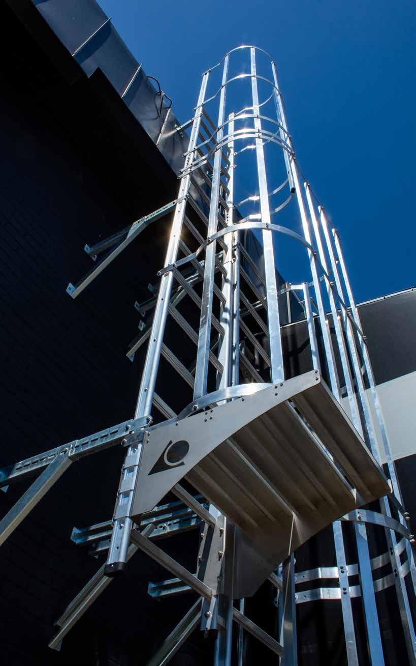 La scala è modulare e adattabile a diverse geometrie grazie a staffe regolabili e pianerottoli, sia standard che personalizzati. Tutti i componenti sono disponibili pronto magazzino per una rapida evasione degli ordini.