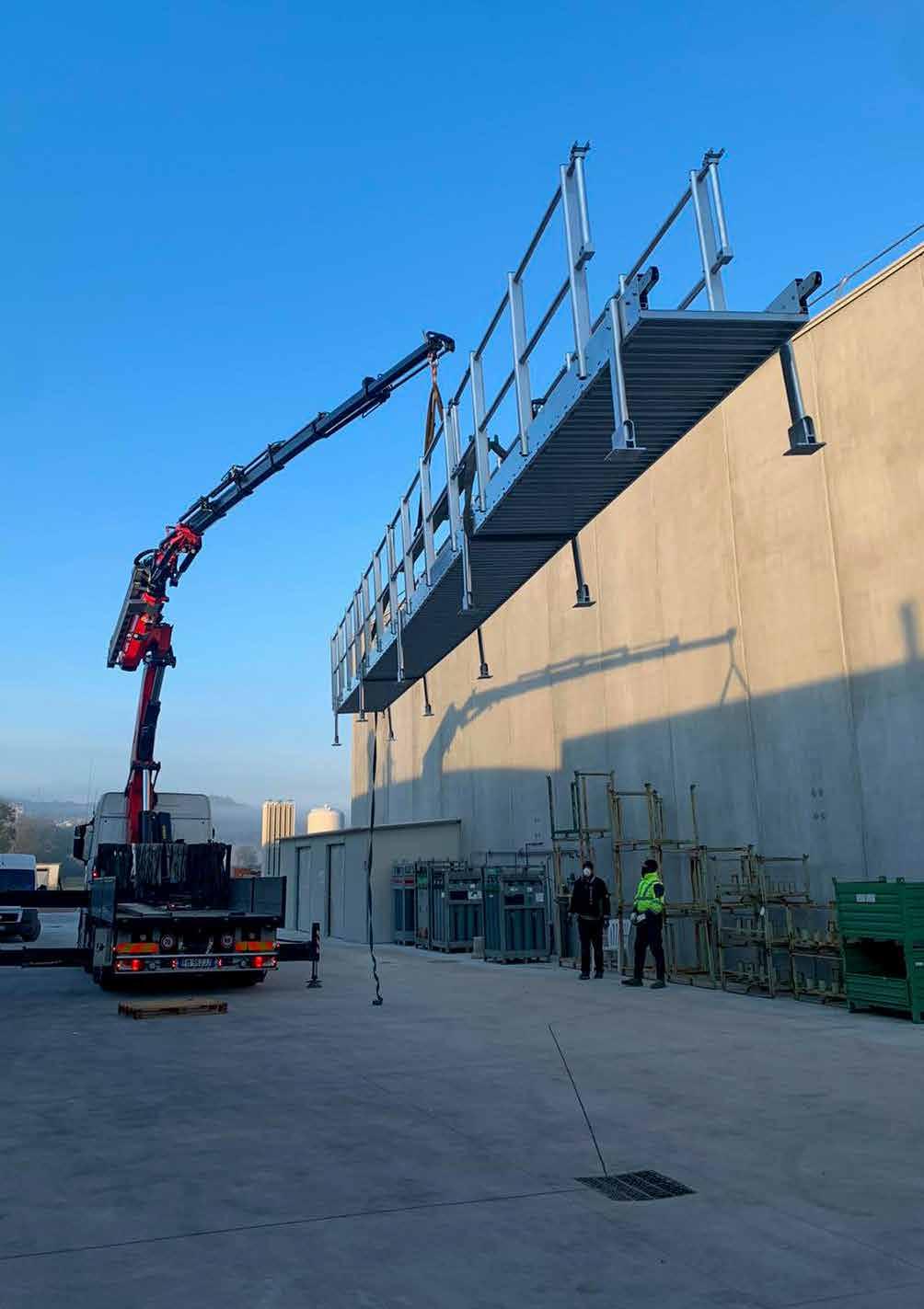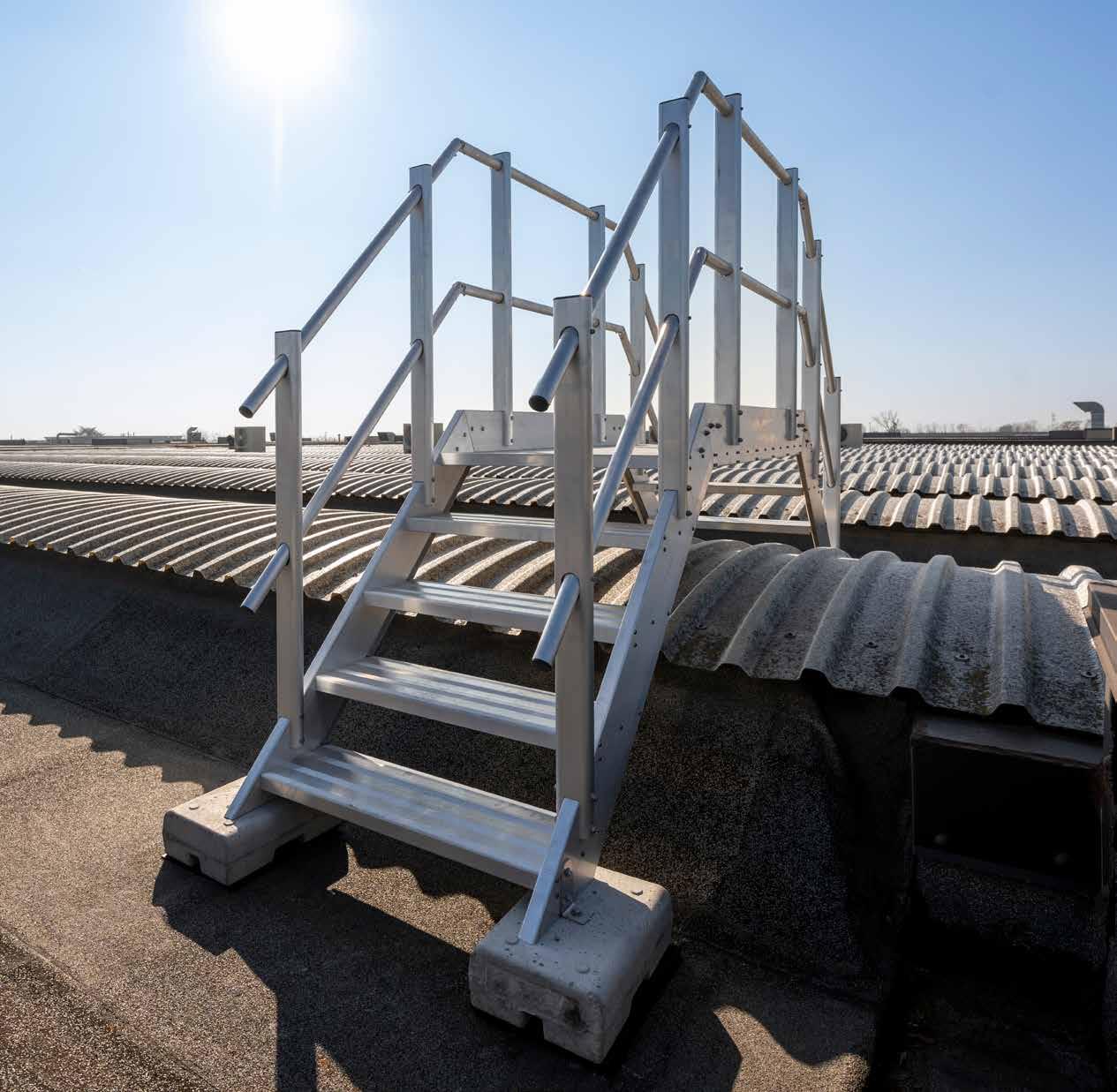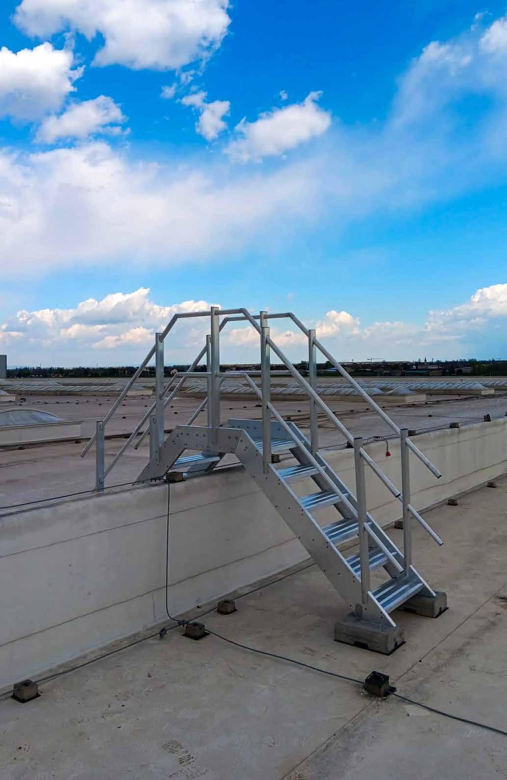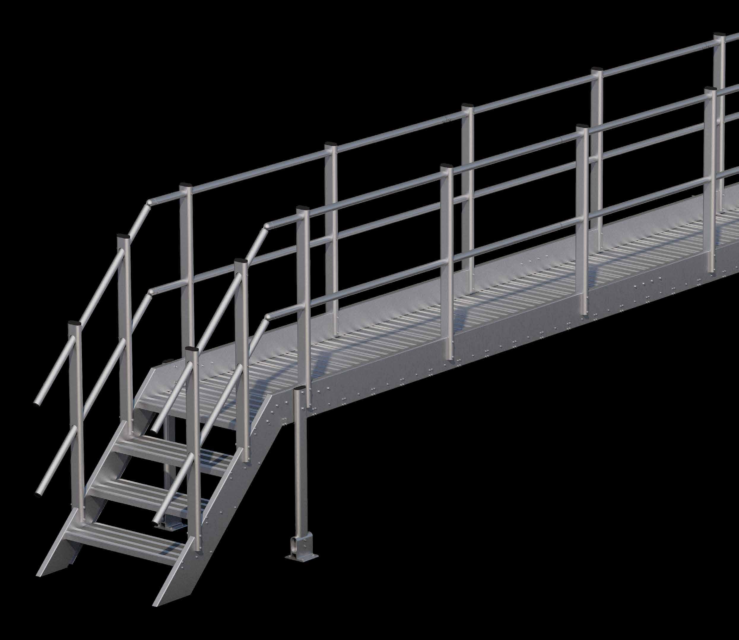 Le passerelle possono essere pre-assemblate o montate in loco, adattandosi a diverse geometrie e superfici di installazione. Tutti i componenti sono disponibili a magazzino per una rapida evasione degli ordini.